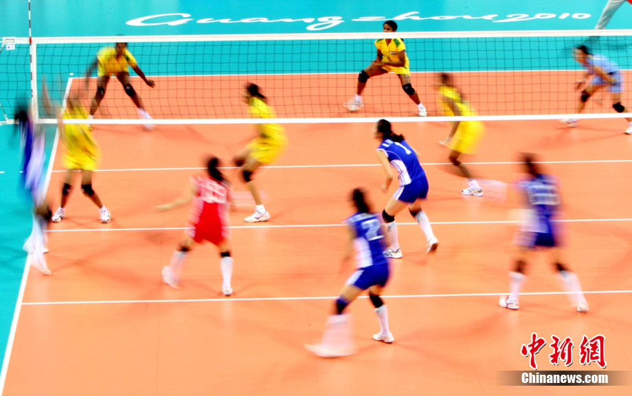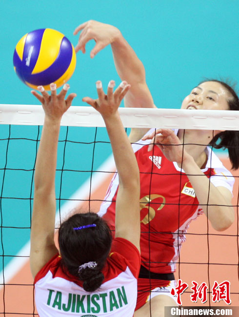 11月18日,廣州亞運會女排比賽全面展開,中國隊首戰(zhàn)迎來塔吉克斯坦隊。最終,中國隊在老將周蘇紅的帶領(lǐng)下,以3比0輕松戰(zhàn)勝塔吉克斯坦隊,迎來開門紅。 中新社記者 湯彥俊 攝