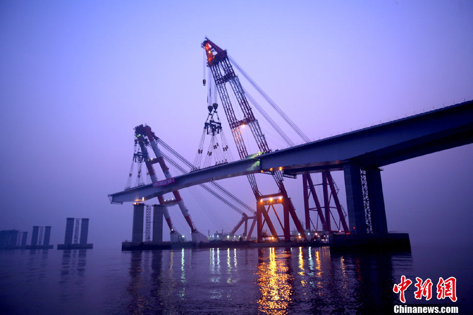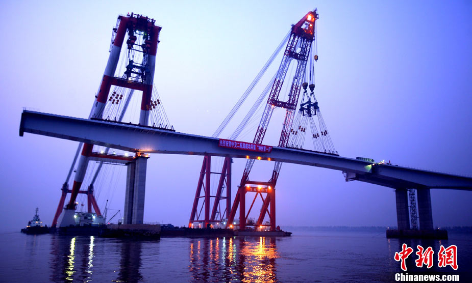 11月19日17時58分,堪稱“神州第一梁”的崇啟大橋首節(jié)185米鋼箱梁吊裝成功。崇啟大橋位于江蘇啟東和上海崇明島之間,長185米、寬16米的主橋變截面鋼箱梁精確吊放標志著崇啟大橋施工難度最大、技術最復雜、安全風險最高的吊裝工程取得關鍵性勝利,創(chuàng)造了國內橋用鋼箱梁架設在單節(jié)起吊規(guī)模上的新記錄。 中新社發(fā) 崇啟橋指 供圖