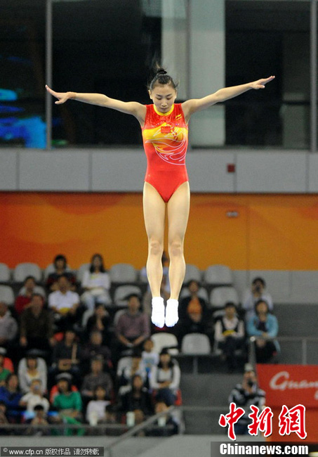 11月21日上午,廣州亞運(yùn)會(huì)蹦床個(gè)人資格賽在亞運(yùn)城體育館上演,中國女子選手何雯娜、黃珊汕;男子選手選手董棟、涂瀟全部順利晉級(jí)決賽。圖為何雯娜亮相亞運(yùn)城體育館。中新網(wǎng)記者 金碩 攝