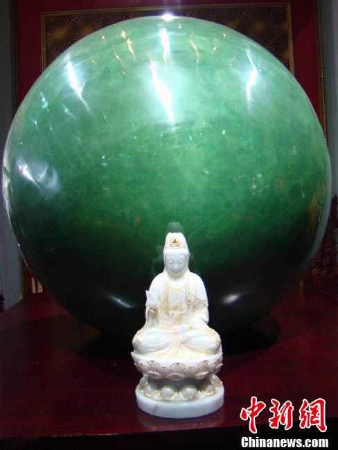 11月21日,一顆重達6噸,直徑1.6米,業(yè)內(nèi)估計價值22億人民幣的夜明珠,在海南僑文昌寶玉宮展出。圖為模特擁抱夜明珠。中新社發(fā) 付美斌 攝