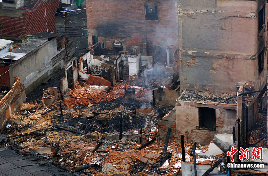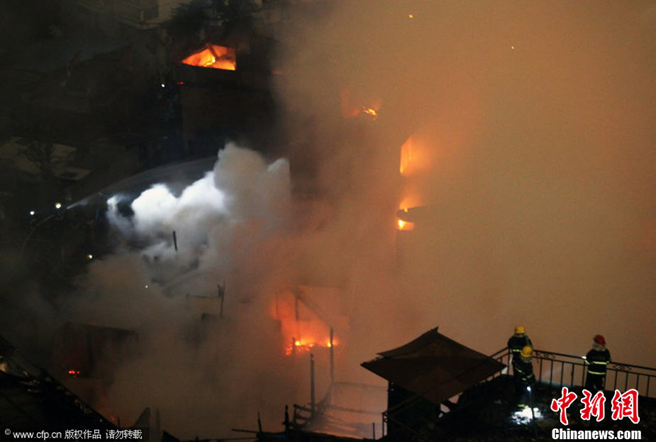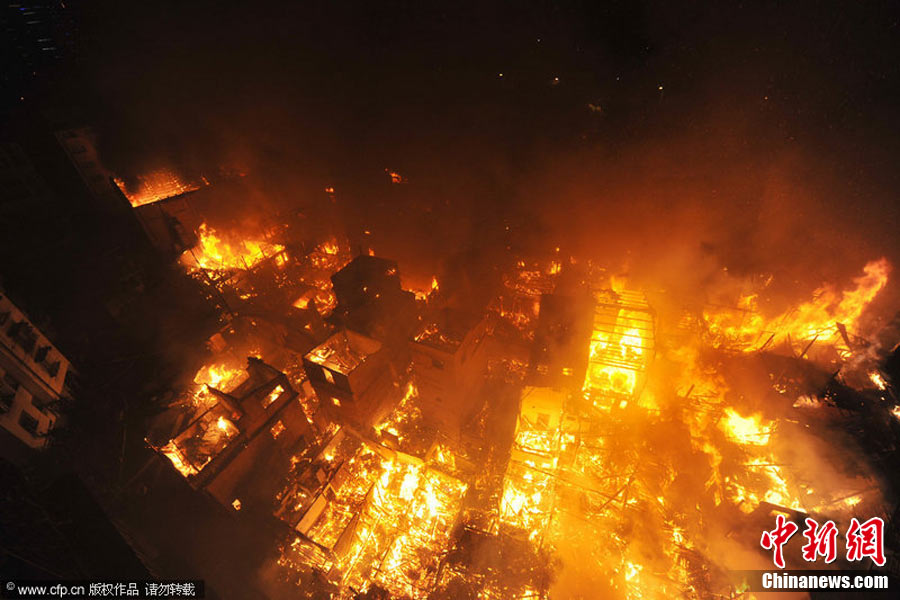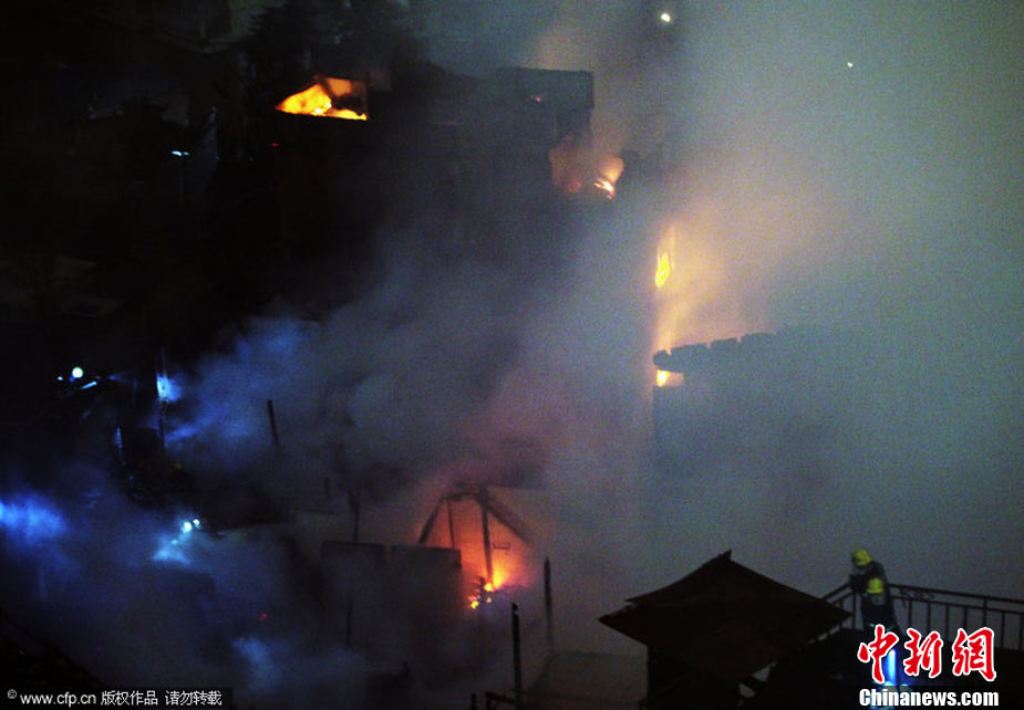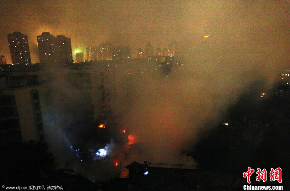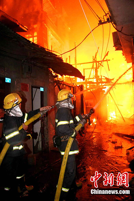 2010年11月21日晚近22時(shí),福州臺(tái)江區(qū)新港街道中選社區(qū)附近一片民房發(fā)生火災(zāi),由于該民房附近主要為棚屋結(jié)構(gòu),大火迅速蔓延,燃燒一個(gè)多小時(shí),火勢(shì)非常猛烈。劉影 攝 圖片來源:CFP視覺中國