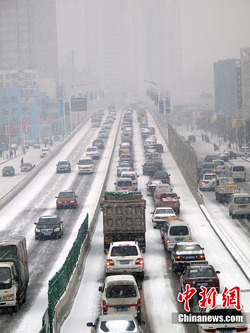 新疆烏魯木齊11月22日上午再度降下大雪,由于大雪的緣故,烏魯木齊街道部分路段交通擁堵,車輛排起長隊(duì)。中新社記者 孫亭文 攝