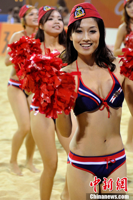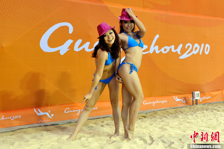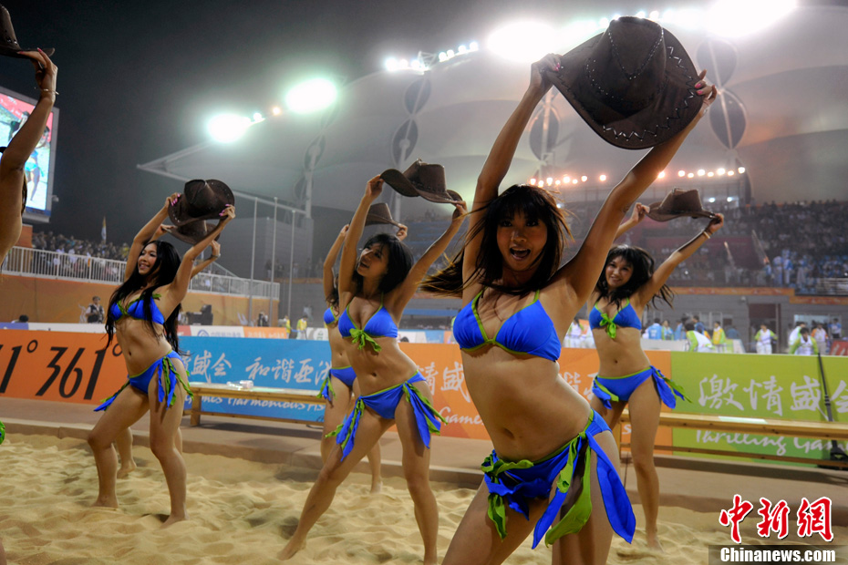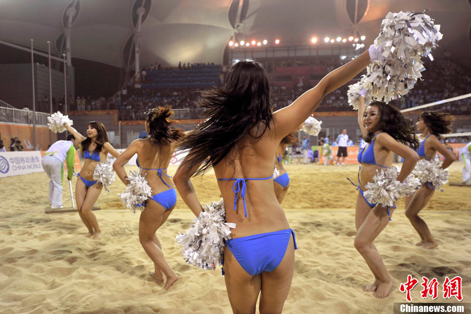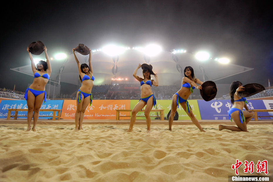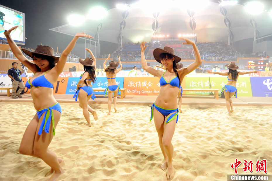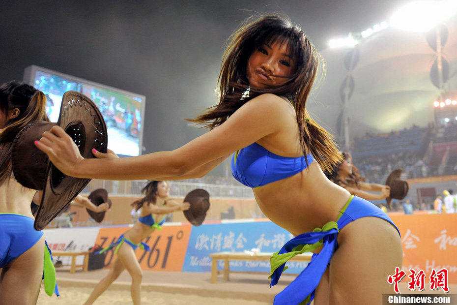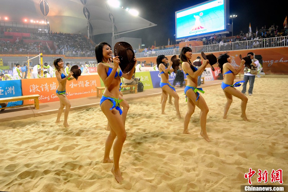 11月24日晚,廣州亞運(yùn)會(huì)沙排比賽完美落幕。青春時(shí)尚的沙排寶貝給人留下深刻印象,她們用熱情點(diǎn)燃現(xiàn)場(chǎng)觀眾的激情,水手裝、海軍帽、藍(lán)色海洋比基尼加上性感熱舞謀殺菲林無數(shù),令人血脈噴張!讓我們?cè)僖淮沃販亍吧撑艑氊悺钡母鞣N性感造型。中新網(wǎng)記者 金碩 攝