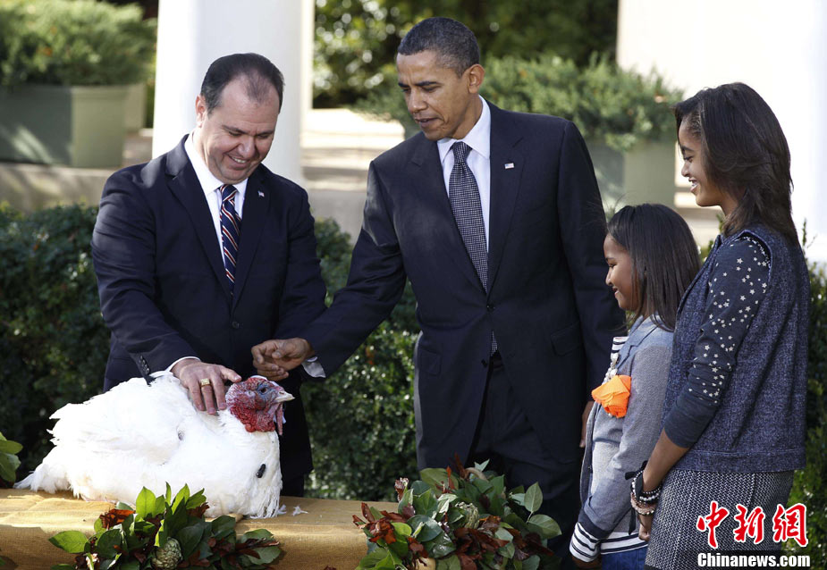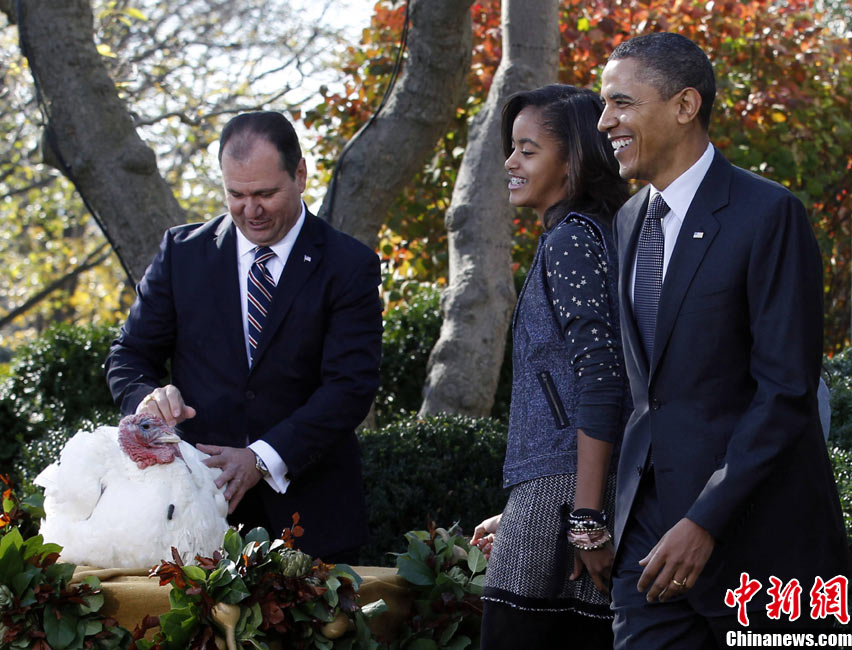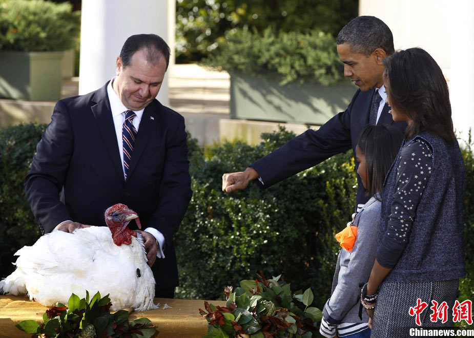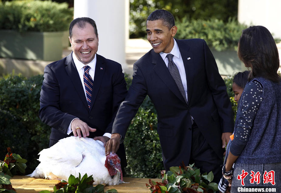 11月24日,兩只分別名叫“蘋果”和“蘋果汁”的加州火雞今天成了全美數(shù)億同類中的幸運兒,在感恩節(jié)前一天,它們得到了“免死金牌”——美國總統(tǒng)奧巴馬依照傳統(tǒng)當(dāng)天親自赦免了它們。