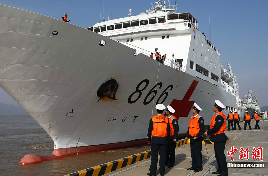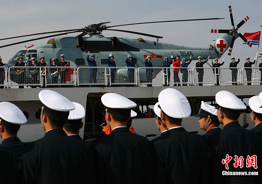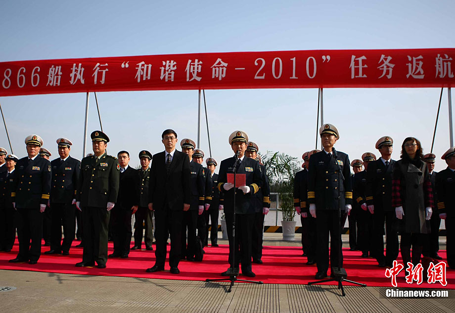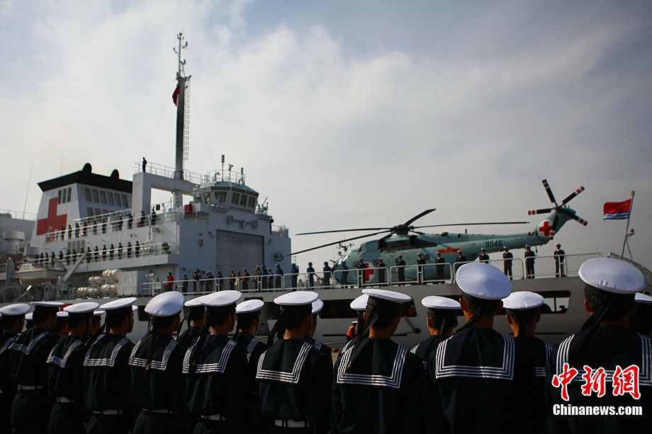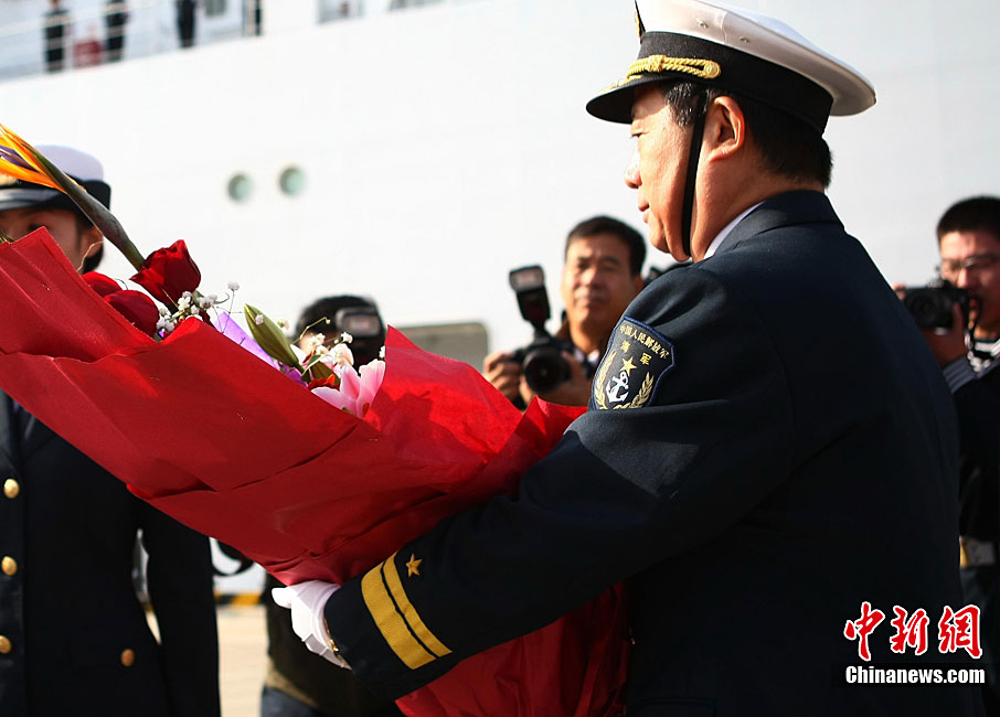 11月26日上午10時(shí),中國(guó)海軍萬(wàn)噸級(jí)醫(yī)院船“和平方舟”安全駛抵舟山軍港,這支歷時(shí)88天、航程17800海里的海上醫(yī)療隊(duì)、為海軍護(hù)航官兵和吉布提、肯尼亞、坦桑尼亞、塞舌爾和孟加拉等國(guó)民眾體檢2127人,門診診治12806人、醫(yī)療巡診1858人,輔助檢查15537人次,成功實(shí)施手術(shù)97例,贈(zèng)送藥材36類790種。海軍副政委徐建中中將迎接執(zhí)行任務(wù)的官兵歸來(lái)。宋吉河 攝