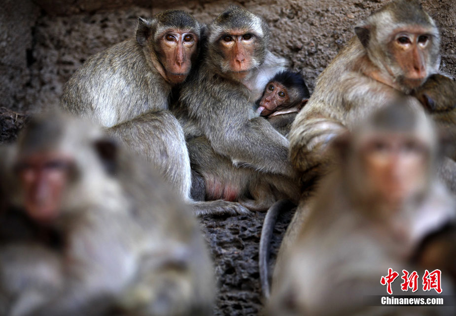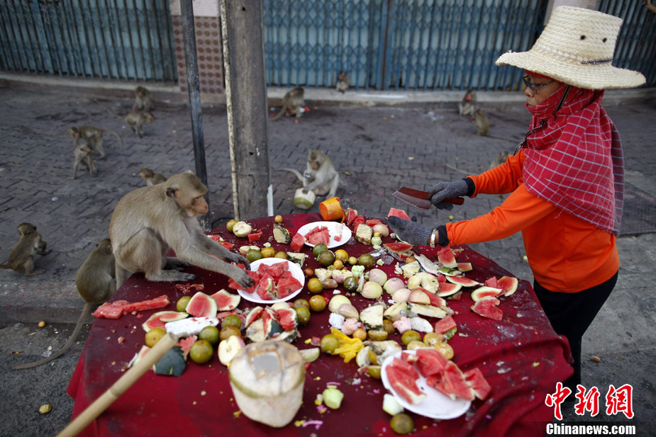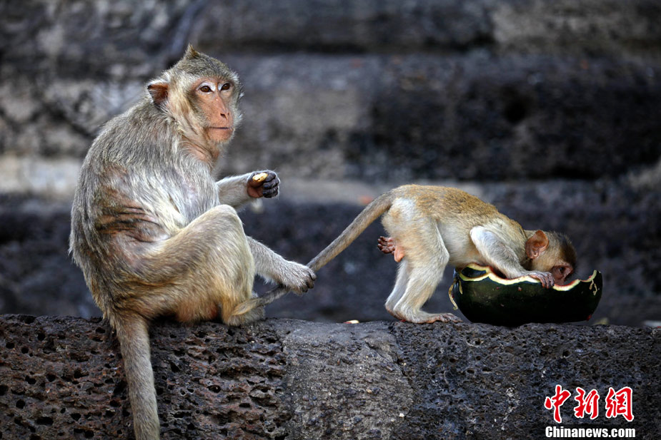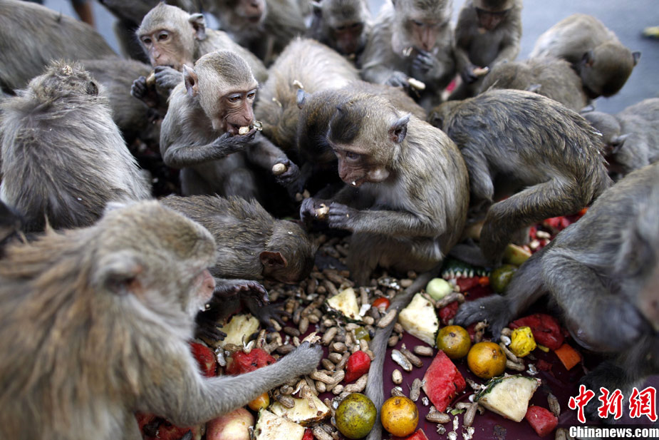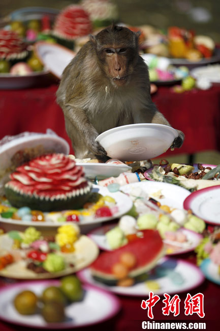泰國舉辦猴子“宴會(huì)” 猴子餐桌大快朵頤