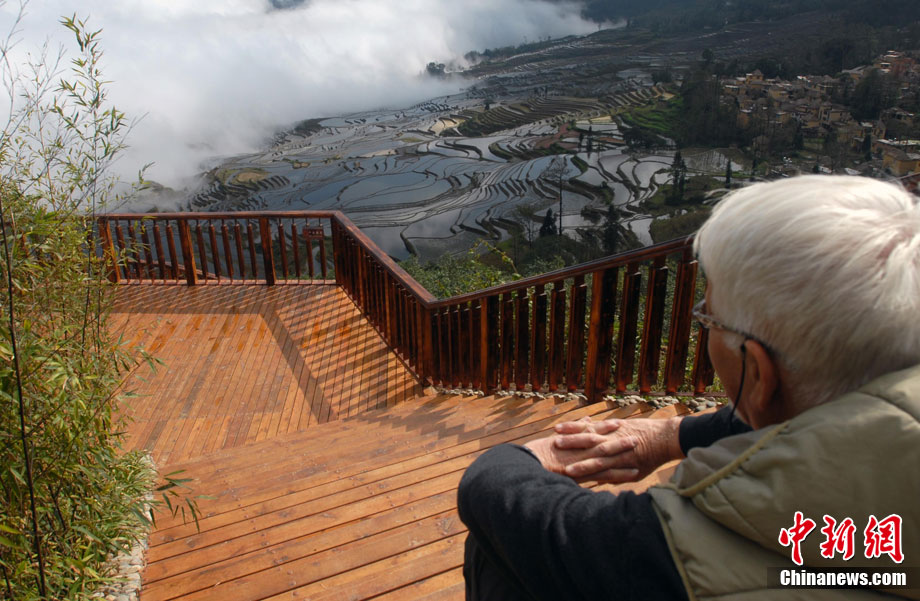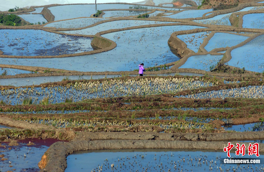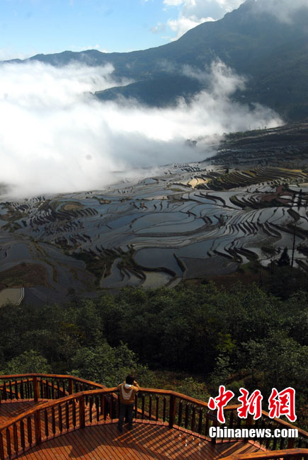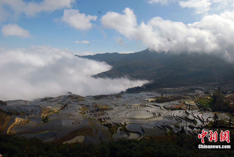 11月30日,被譽(yù)為世界最壯觀的云南元陽(yáng)哈尼梯田迎來(lái)了最佳觀景時(shí)機(jī),萬(wàn)畝梯田氣勢(shì)磅礴,讓聞名而來(lái)的游客感嘆大自然的鬼斧神工。據(jù)了解,每年的11月底至次年的2月梯田中已經(jīng)放水備耕而田中無(wú)稻谷,是最佳的拍攝觀景時(shí)間。中新社發(fā) 任東 攝