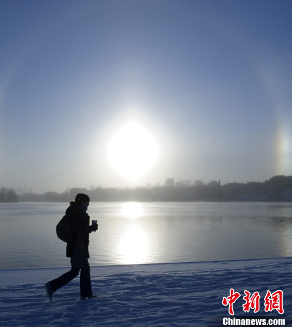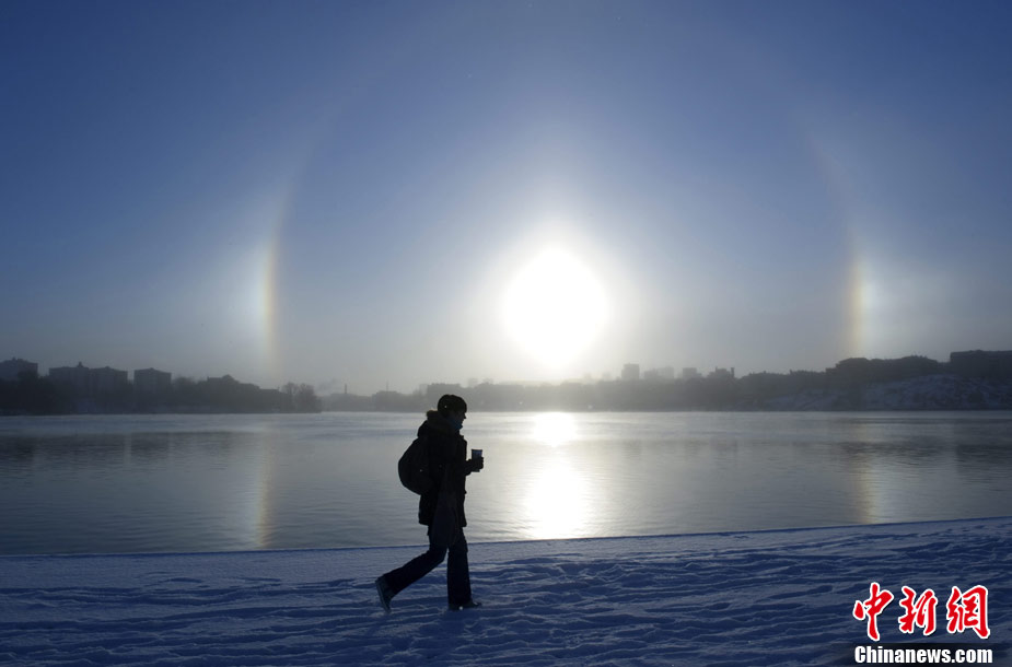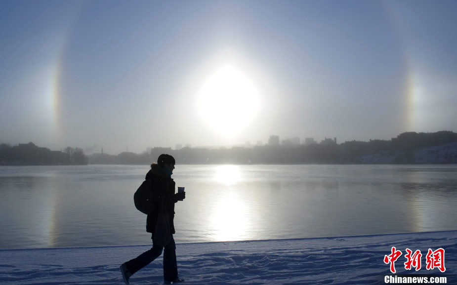 11月30日,瑞典斯德哥爾摩,梅拉倫湖上空出現(xiàn)幻日現(xiàn)象;萌宅F(xiàn)象是一種罕見的光暈現(xiàn)象,日光在大氣層中的冰微粒上發(fā)生反射、折射和衍射就可能產(chǎn)生幻日。