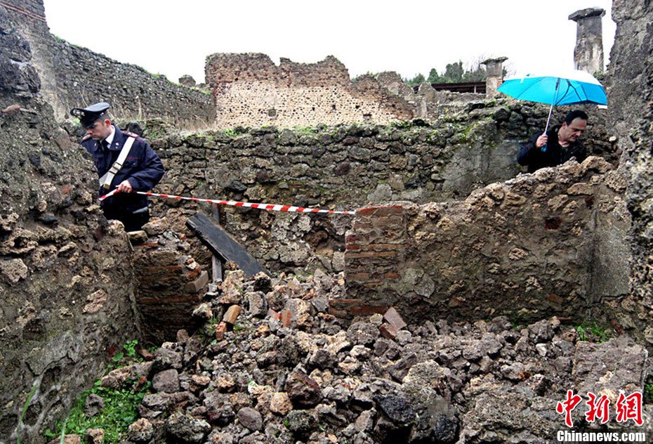 11月30日,有兩千多年歷史的龐貝古城一處古建筑的墻壁發(fā)生坍塌,當(dāng)?shù)乜脊艑<曳Q,這是由于連日來(lái)的持續(xù)降雨所致,不過(guò)倒塌的墻壁上沒(méi)有壁畫(huà)。就在此前一天,同樣由于降雨,龐貝古城的“道德者之家”外墻也發(fā)生倒塌。所幸這堵巖石外墻距離“道德者之家”還有一段距離,坍塌沒(méi)有威脅到建筑外墻的著名題詞。這兩起建筑倒塌事件被視為近期龐貝古建筑的“新傷”。圖片來(lái)源:CFP/視覺(jué)中國(guó)
