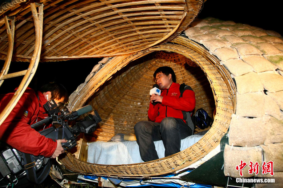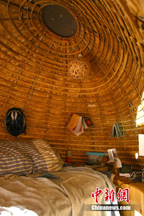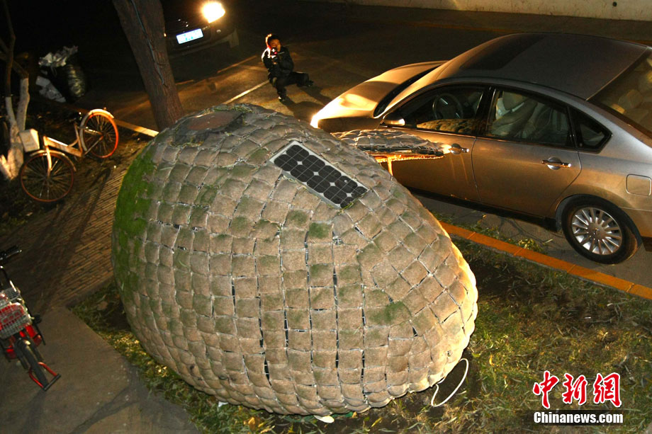 近日,來(lái)自湖南的24歲青年戴海飛在北京市海淀區(qū)成府路的一個(gè)大院里,搭起一個(gè)“蛋形”小屋,作為自己的蝸居。小屋兩米多高,“蛋殼”上有一個(gè)橢圓形的小門(mén),沒(méi)有鎖。小屋的下邊裝有輪子,可以挪動(dòng)。小屋引起了多家媒體的高度關(guān)注,2日深夜有大批的記者來(lái)到小屋采訪,而戴海飛卻不知因何一直沒(méi)有露面,直到深夜11點(diǎn)多,也沒(méi)有回到小屋。中新社記者 富田 攝