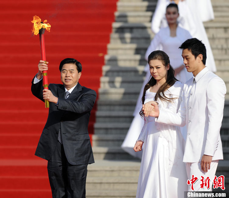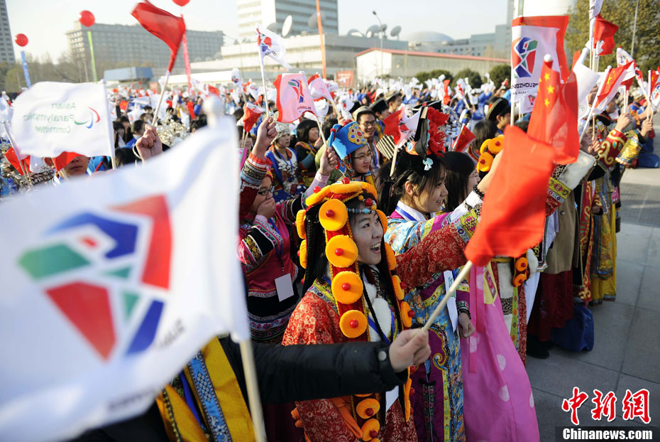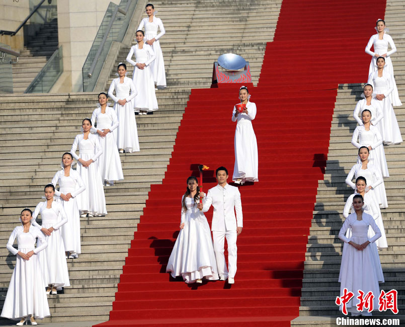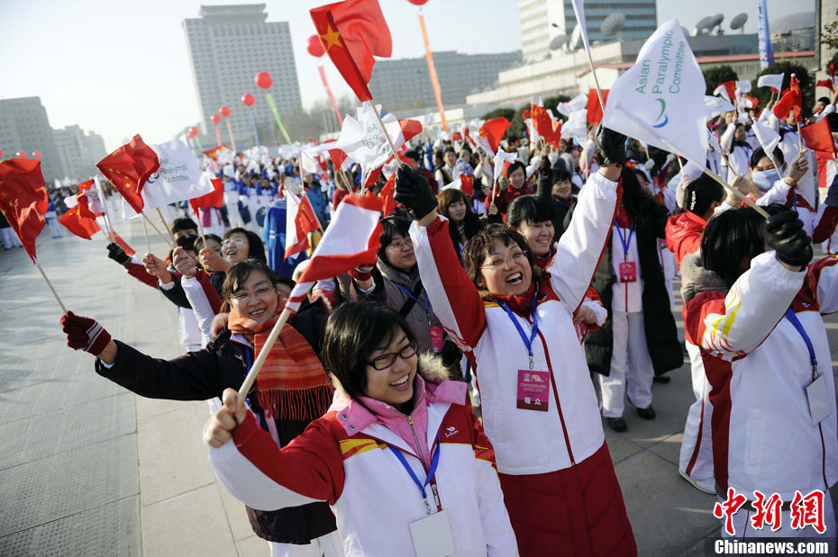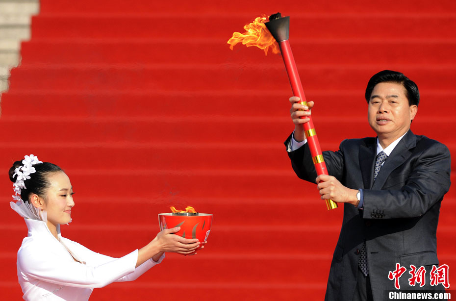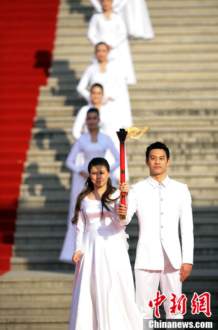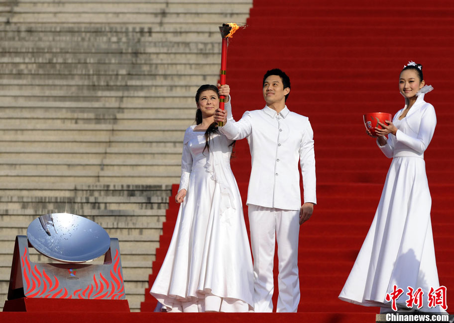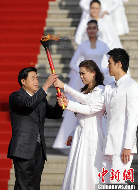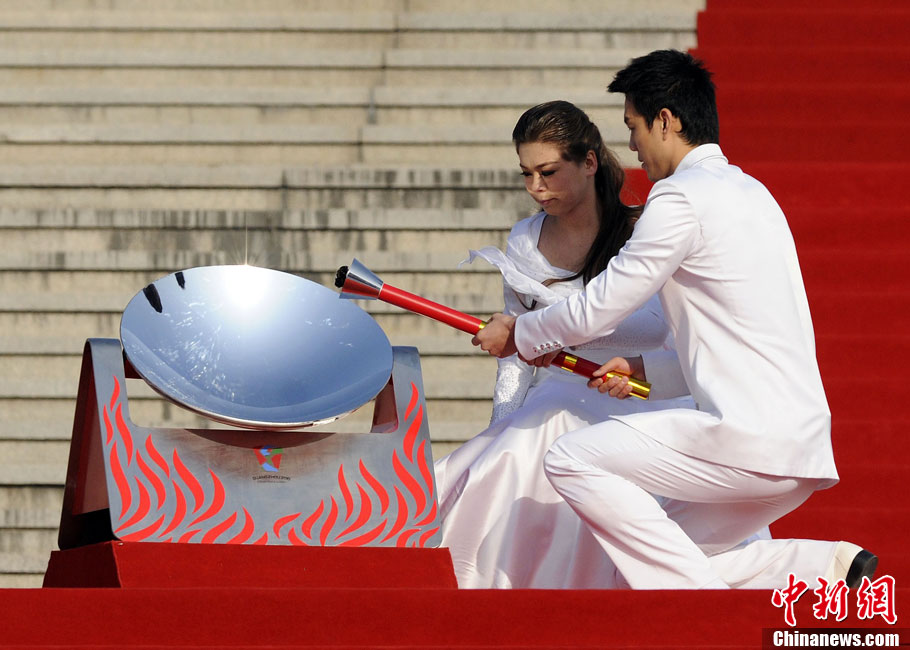 12月3日,采火使者阿迪蘭(左)和周嘉威成功采集亞殘運(yùn)會火種。當(dāng)日,廣州2010年亞洲殘疾人運(yùn)動(dòng)會火種采集儀式在北京中華世紀(jì)壇舉行。兩名采火使者分別是來自新疆特殊教育職業(yè)中學(xué)的學(xué)生阿迪蘭和廣州亞運(yùn)會三枚金牌得主游泳名將周嘉威。中新社記者 劉震 攝