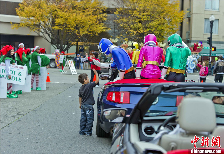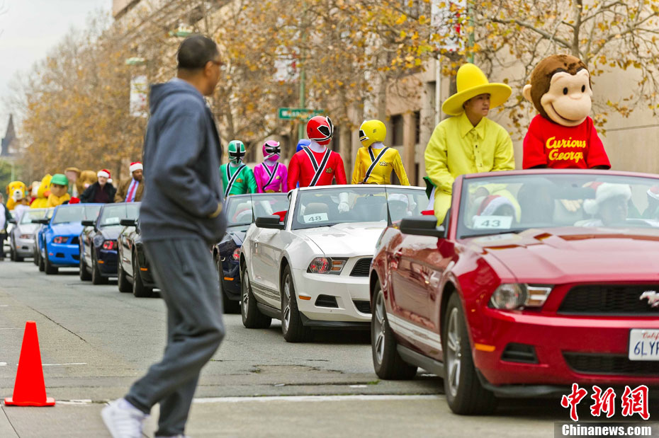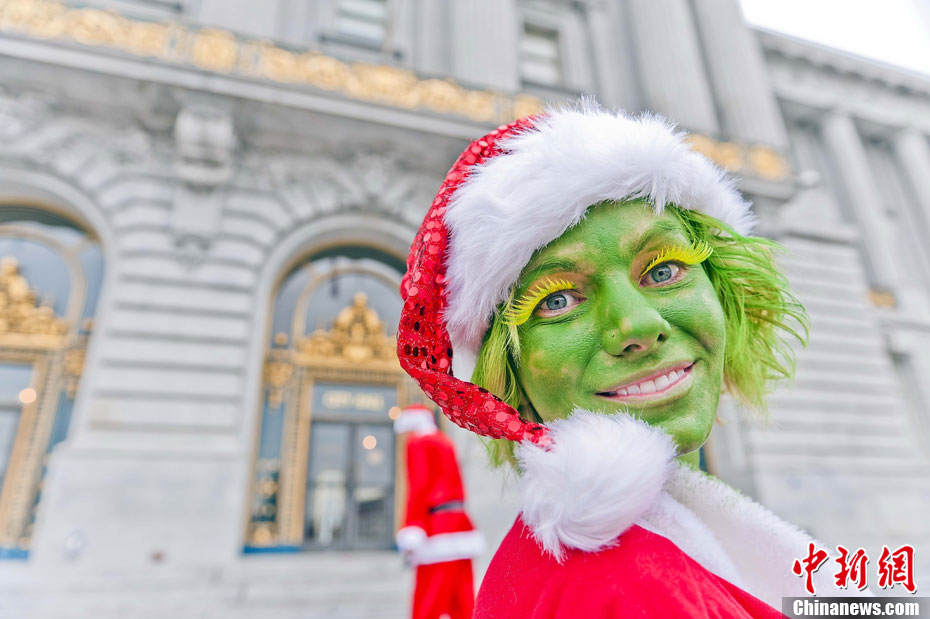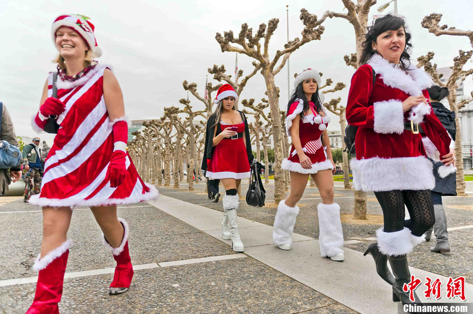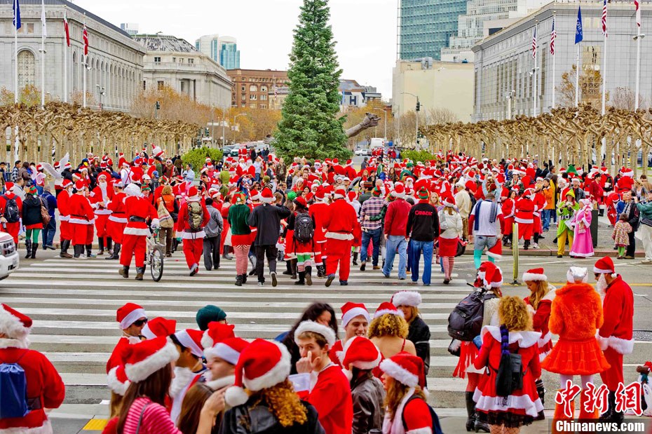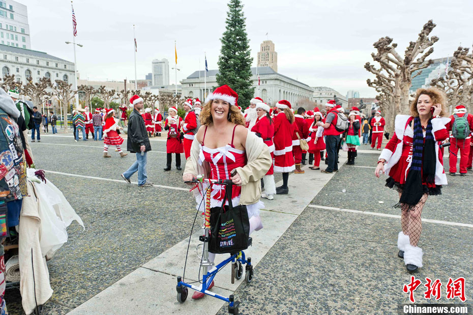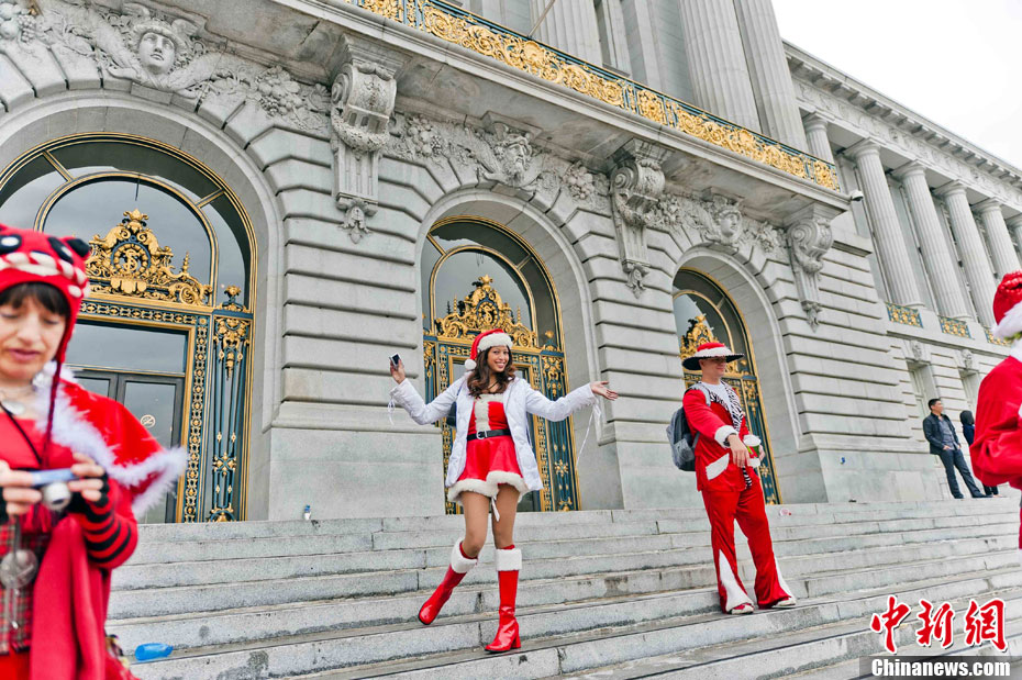 當(dāng)?shù)貢r(shí)間12月4日下午,千余名裝扮成圣誕老人的男男女女聚集在美國(guó)舊金山市政府廣場(chǎng)前,以歌舞形式迎接圣誕佳節(jié)。圖為情侶們的開心一刻。中新社發(fā) 陳鋼 攝