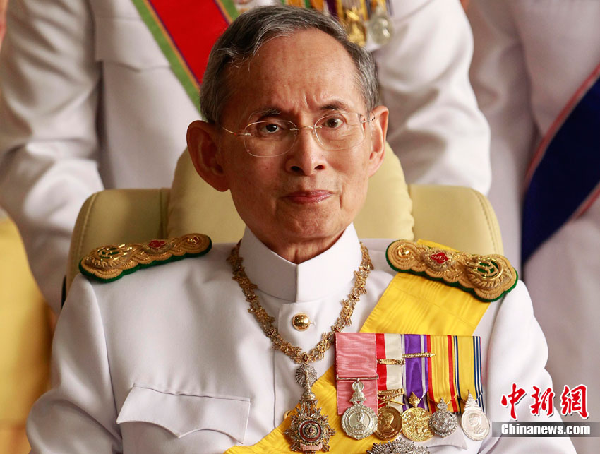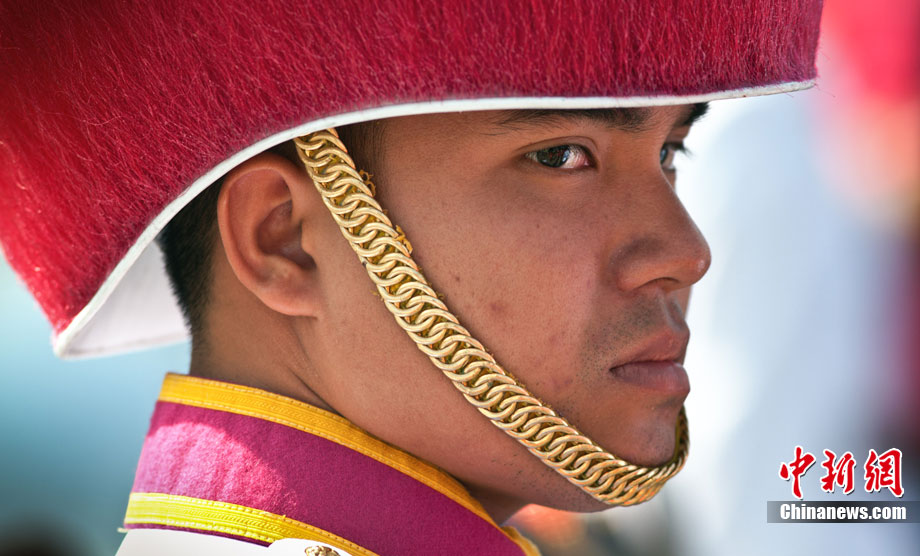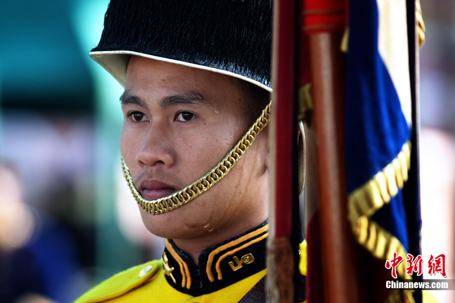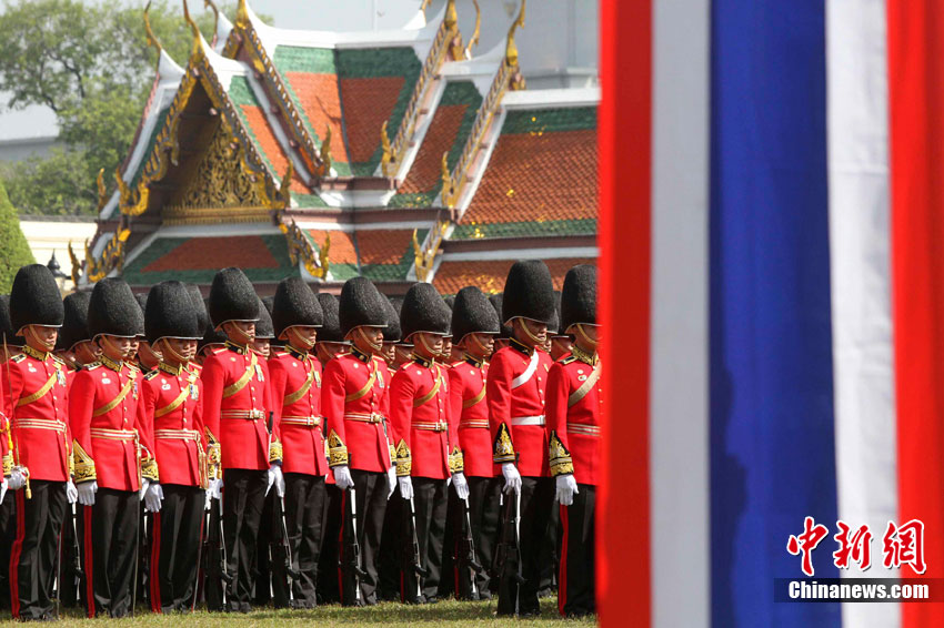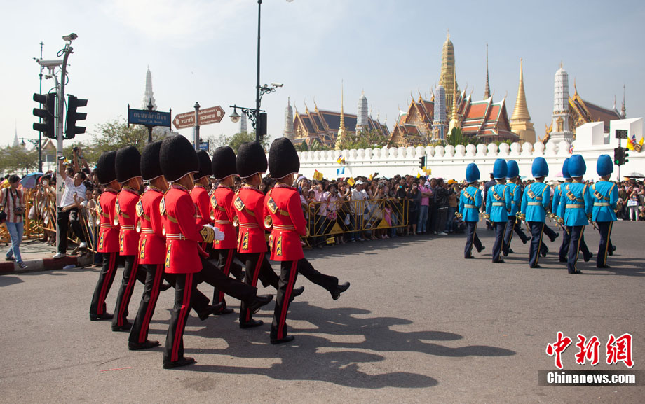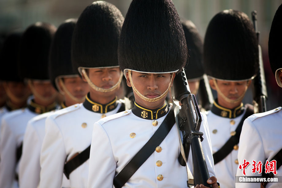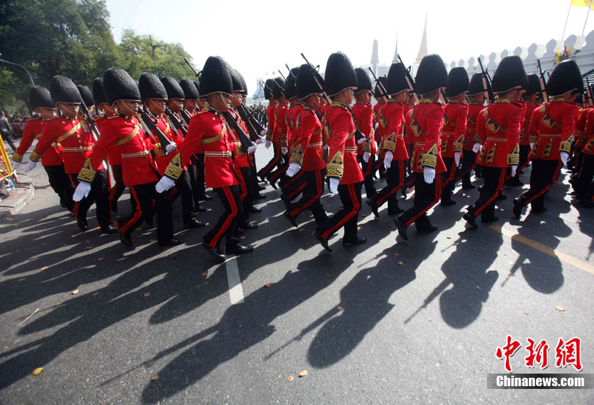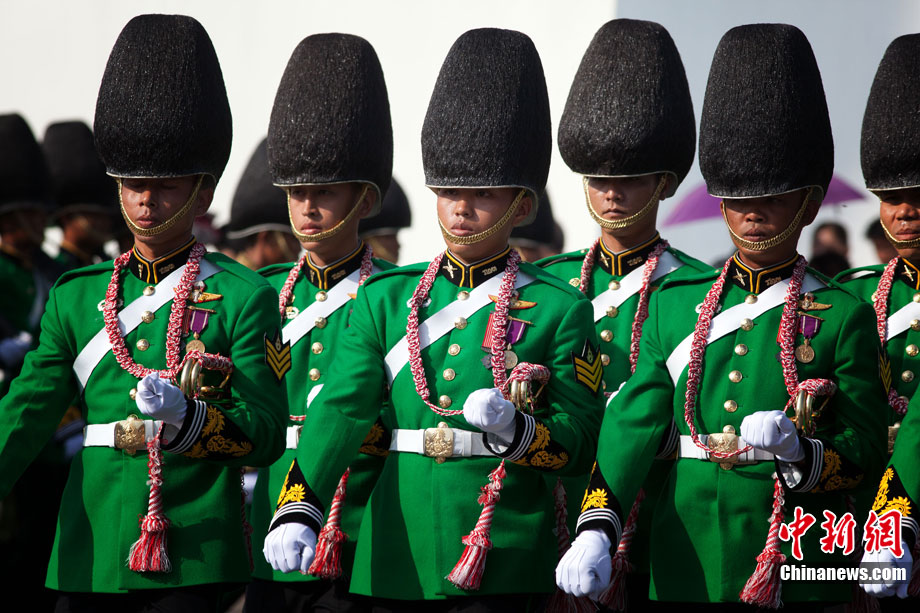 當?shù)貢r間12月5日,泰國各界齊聚曼谷市中心的大王宮,慶祝泰王普密蓬83歲大壽。泰國皇家衛(wèi)隊士兵身著紅、綠、黑、蘭等各種顏色的軍服進行游行,為泰王慶祝生日。