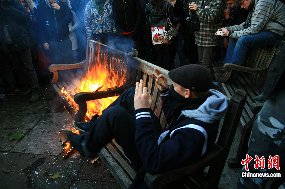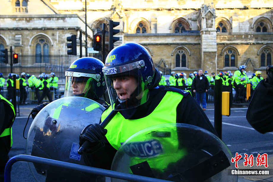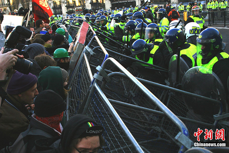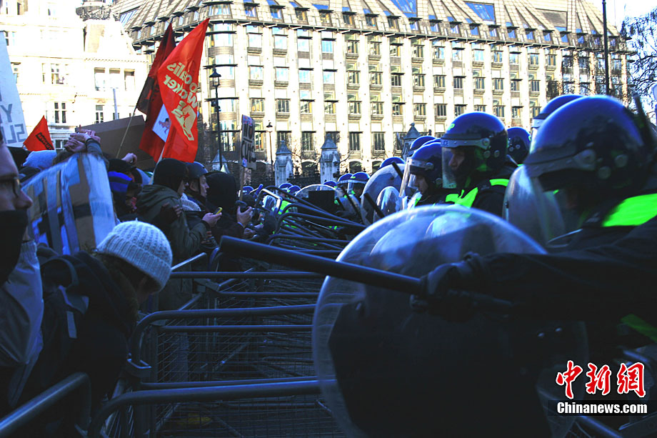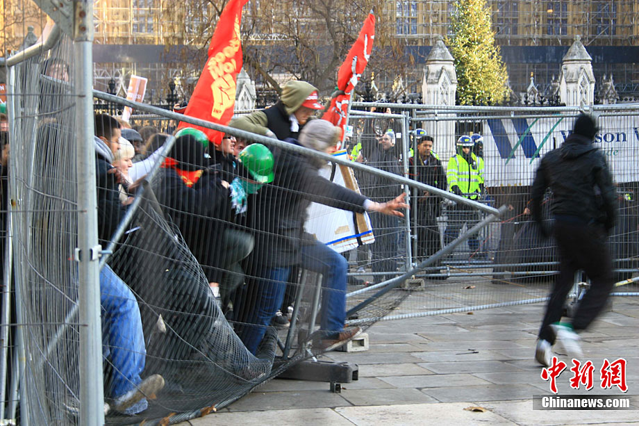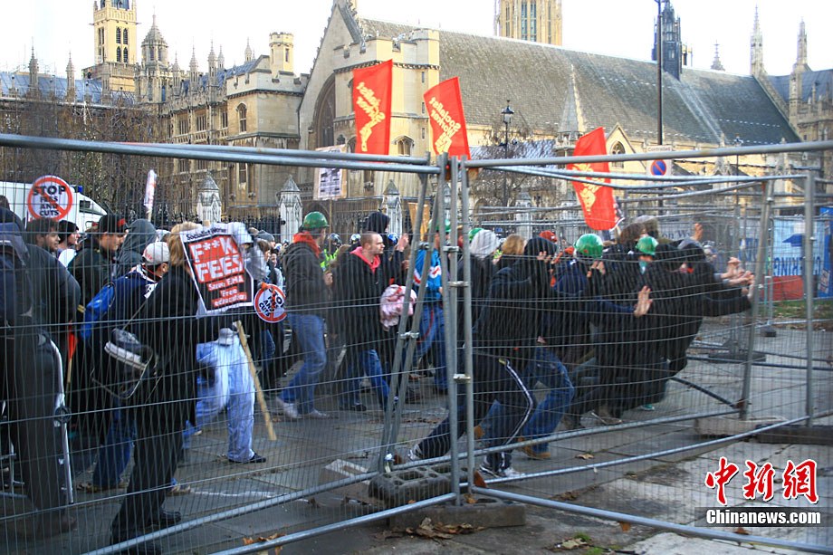 當(dāng)?shù)貢r間12月9日,為抗議議會表決通過政府有關(guān)大學(xué)學(xué)費(fèi)上漲提案,倫敦爆發(fā)大規(guī)模學(xué)生抗議示威,引發(fā)示威者與警方?jīng)_突,37人受傷,15人被捕。圖為示威者沖破議會大廈前廣場施工柵欄。中新社記者 魏群 攝