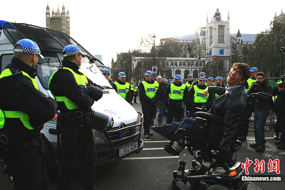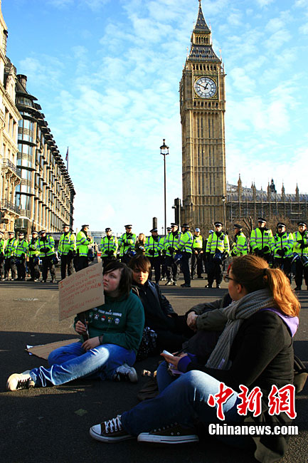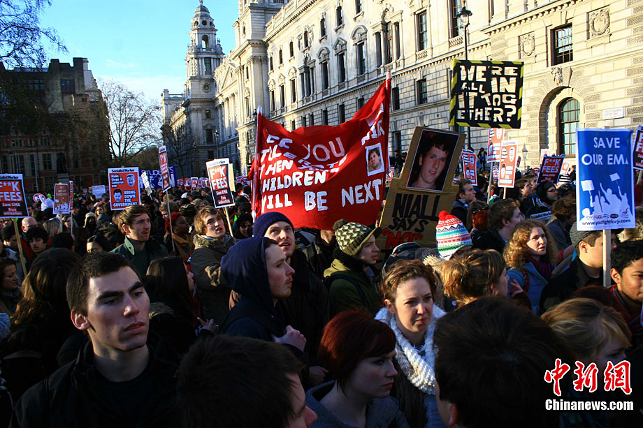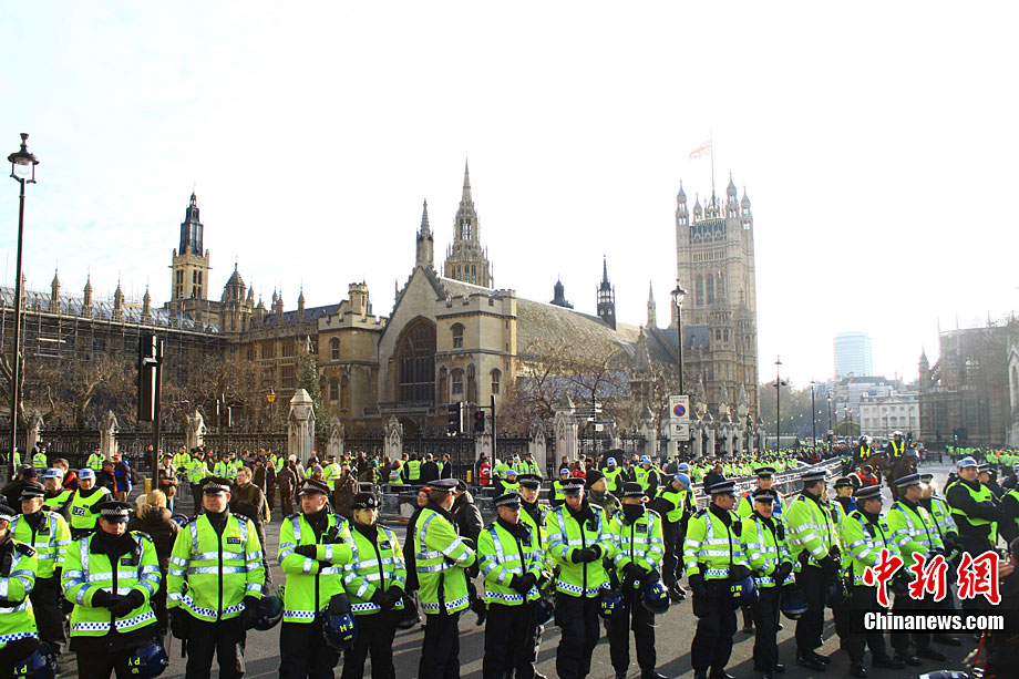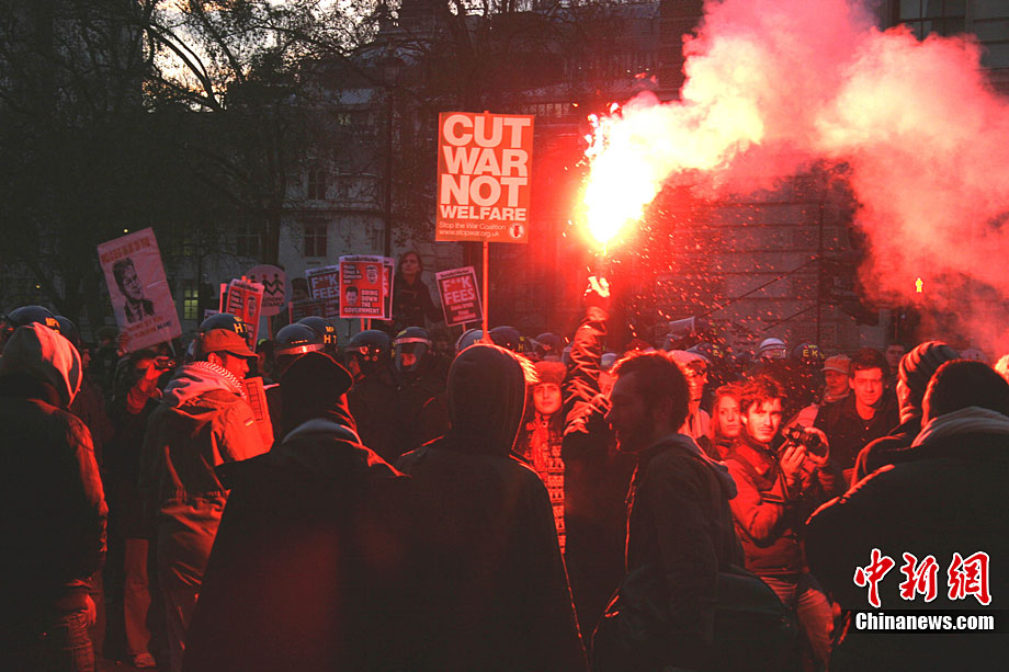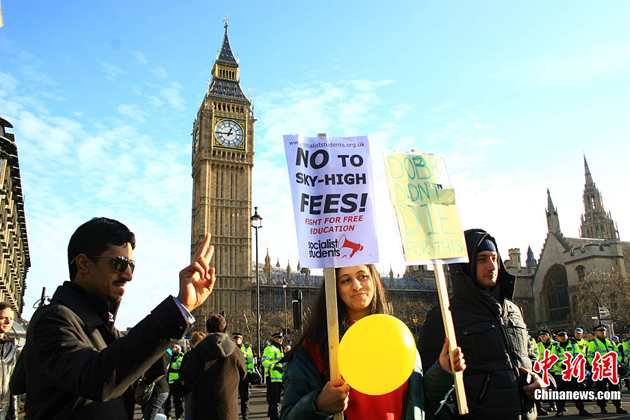 當(dāng)?shù)貢r間12月9日,為抗議議會表決通過政府有關(guān)大學(xué)學(xué)費(fèi)上漲提案,倫敦爆發(fā)大規(guī)模學(xué)生抗議示威,引發(fā)示威者與警方?jīng)_突,37人受傷,15人被捕。圖為示威者沖破議會大廈前廣場施工柵欄。中新社記者 魏群 攝