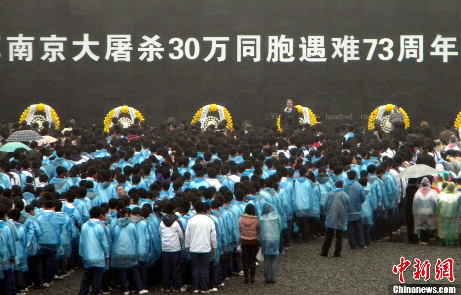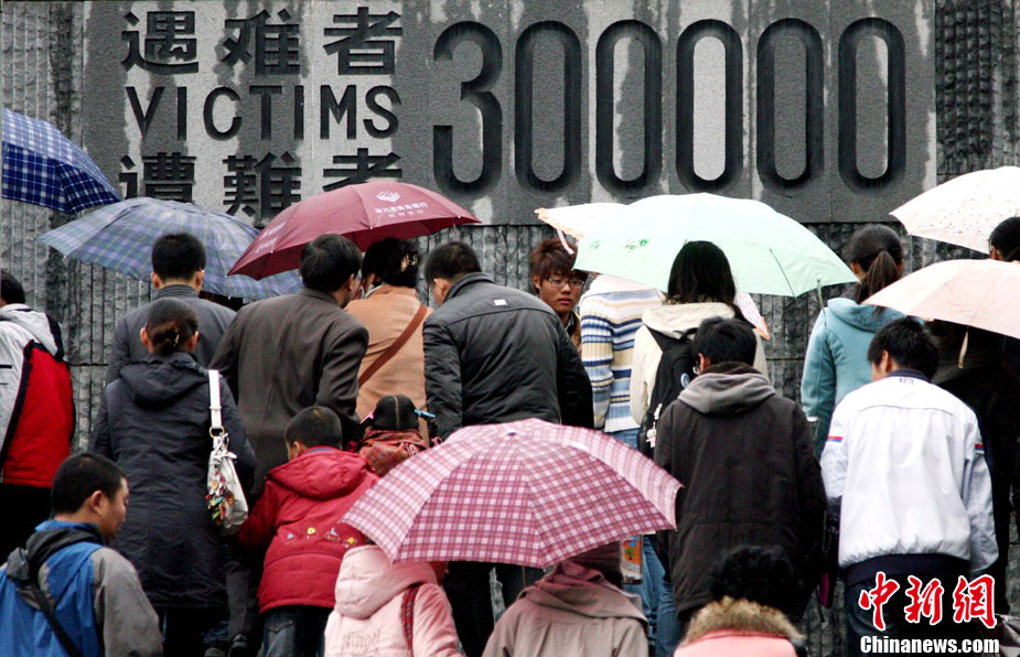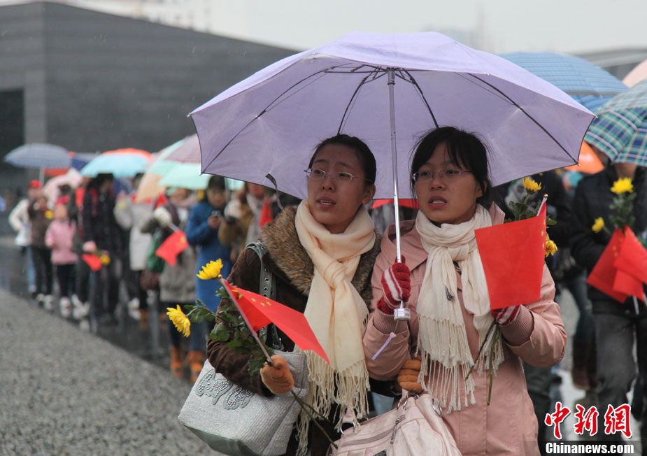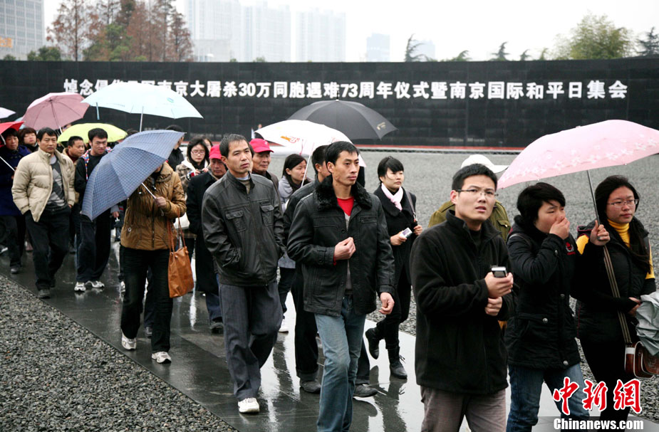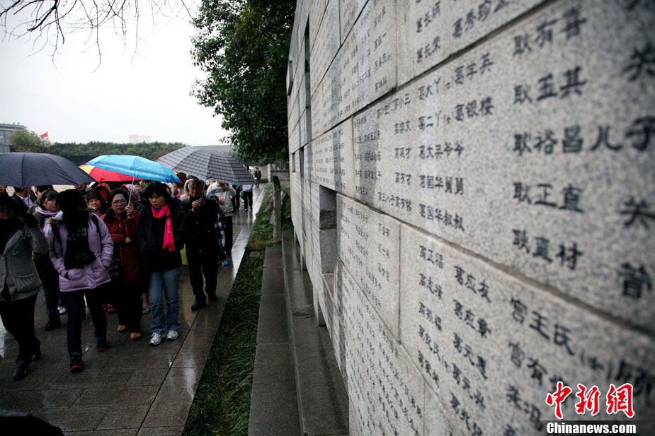 12月13日是南京大屠殺遇難同胞73周年祭日,12日起,江蘇南京將舉行和平集會、和平法會等系列活動,悼念30萬遇難同胞。圖為南京市民12日冒雨前往南京大屠殺遇難同胞紀(jì)念館悼念。 鐘山 攝 圖片來源:CNSPHOTO
