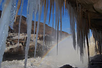 12月15日,受大風(fēng)降溫天氣的影響,黃河壺口段開始大面積流凌。壺口瀑布兩岸的巖石和護欄上也開始凝結(jié)一排排美麗壯觀的冰掛,晶瑩剔透,造型各異,與瀑布中飛舞的彩虹交相輝映,為冬日的壺口瀑布平添了幾分秀色,讓許多游客流連忘返,頻頻舉起手中的相機拍照留念。呂桂明 攝 圖片來源:CNSPHOTO