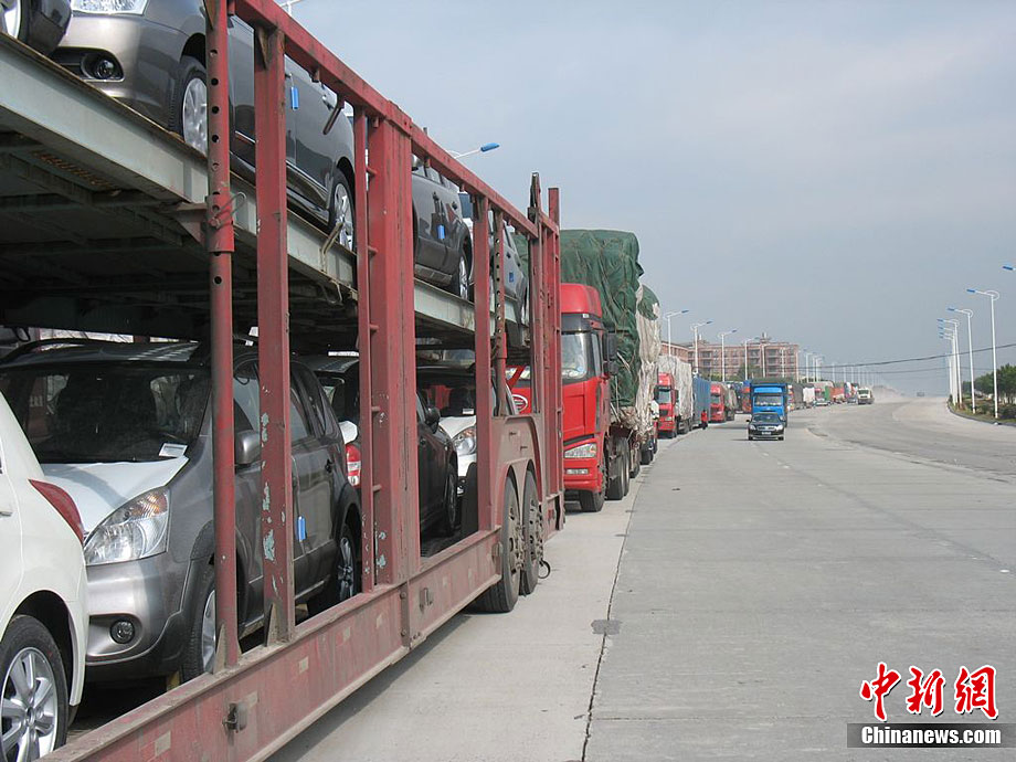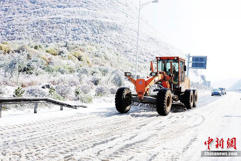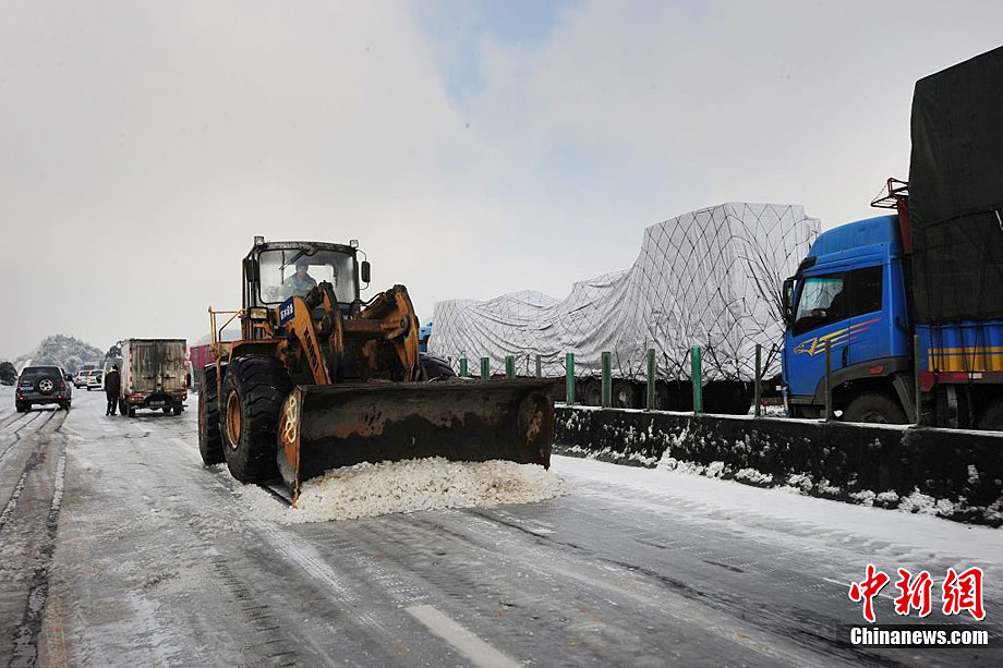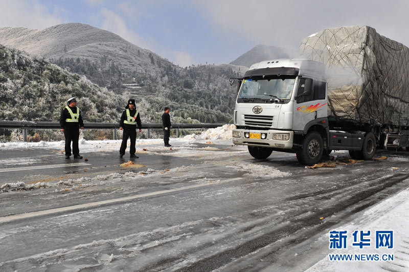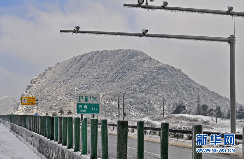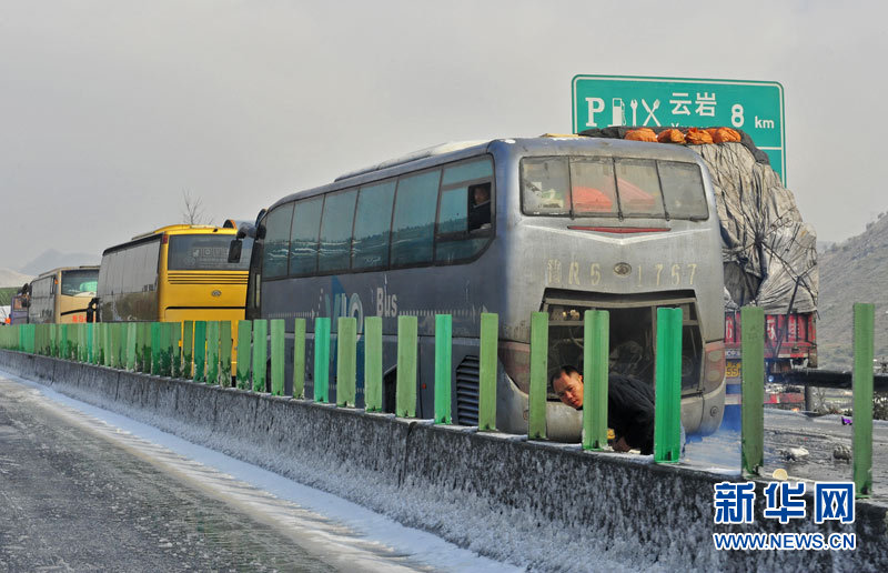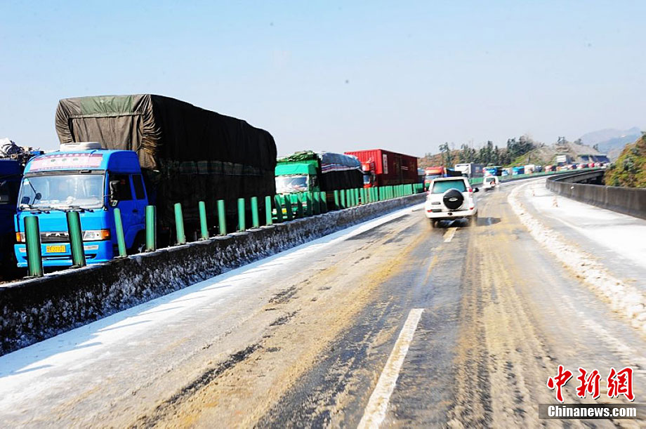 受強(qiáng)冷空氣南下影響,廣東北部山區(qū)氣溫降至零下,境內(nèi)的京港澳高速乳源段和坪乳公路路面結(jié)冰,交通從12月16日凌晨開(kāi)始中斷,大量車(chē)輛滯留。經(jīng)全力抗冰搶險(xiǎn),相關(guān)路段于16日14時(shí)許恢復(fù)正常通行。17日,已搶通的京港澳高速公路粵北段路面再次結(jié)冰,車(chē)輛滯留10公里。李凌 攝