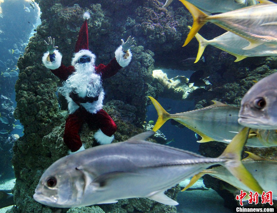12月17日,摩納哥水族館內(nèi),自由潛水世界紀(jì)錄保持者弗若拉打扮成圣誕老人,在水下與魚兒親密接觸迎接圣誕節(jié)。