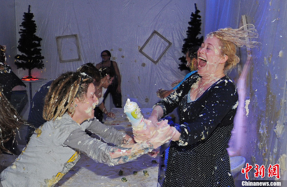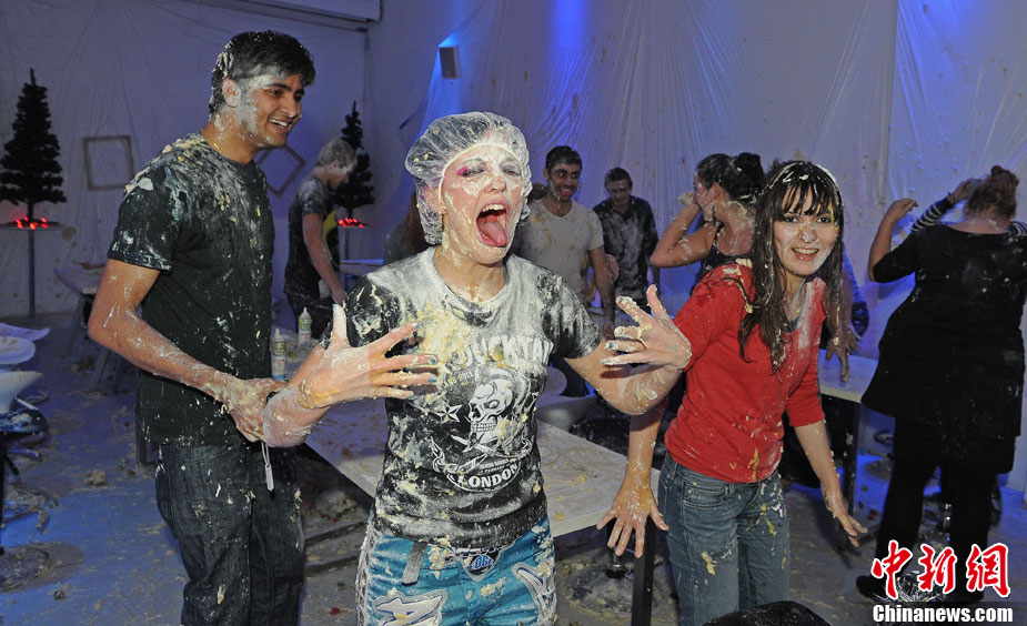2010年12月18日,人們?cè)谟?guó)倫敦一家畫(huà)廊中參加圣誕食物大戰(zhàn)活動(dòng)。在活動(dòng)中人們用甘藍(lán)、土豆泥、果凍及奶油等食品互相“攻擊”,此活動(dòng)的門(mén)票收入將捐獻(xiàn)給慈善機(jī)構(gòu)。