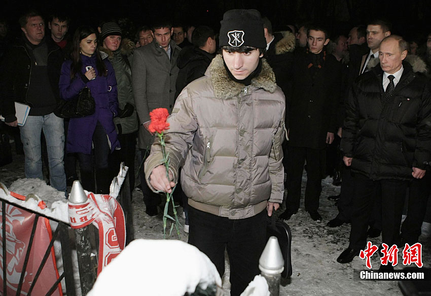當(dāng)?shù)貢r(shí)間12月21日,俄羅斯總理普京與部分球迷一起,來到日前被槍殺的莫斯科斯巴達(dá)克足球俱樂部球迷葉戈?duì)?#183;斯維里多夫的墓前,獻(xiàn)上鮮花表達(dá)哀思。12月5日夜間至6日凌晨,一群斯巴達(dá)克隊(duì)的球迷與一撥來自北高加索地區(qū)的年輕人在莫斯科北部的喀瑯施塔得林蔭道某汽車站附近發(fā)生斗毆,結(jié)果球迷葉戈?duì)?#183;斯維里多夫被槍殺身亡。