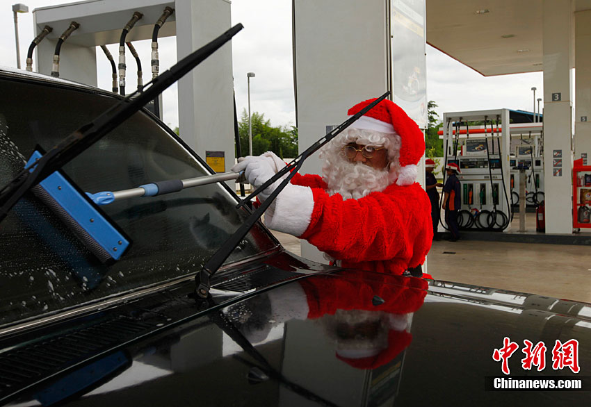 12月23日,印度尼西亞坦格朗市的一座加油站內(nèi),工作人員身著圣誕老人的服裝,為過往車輛加油、洗車。