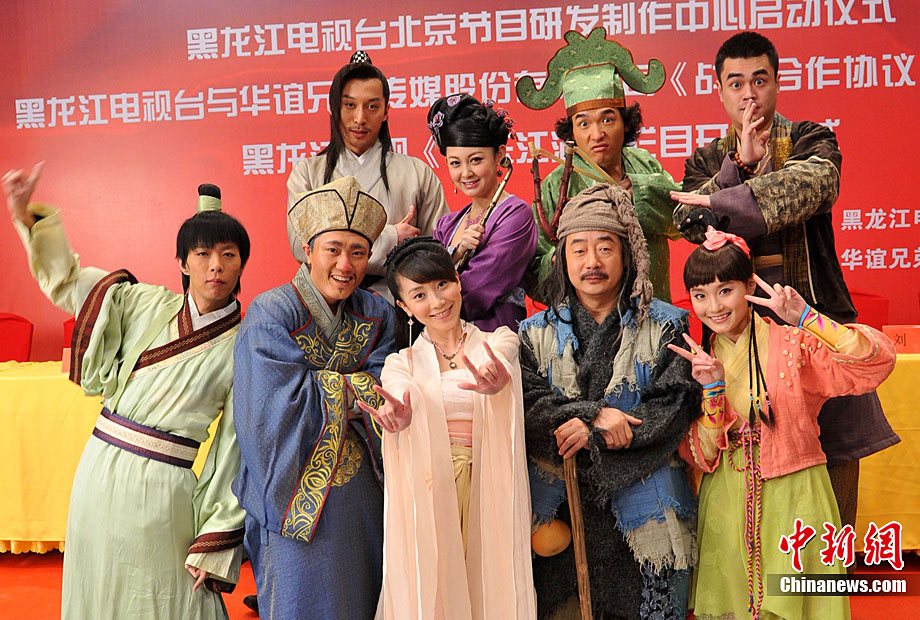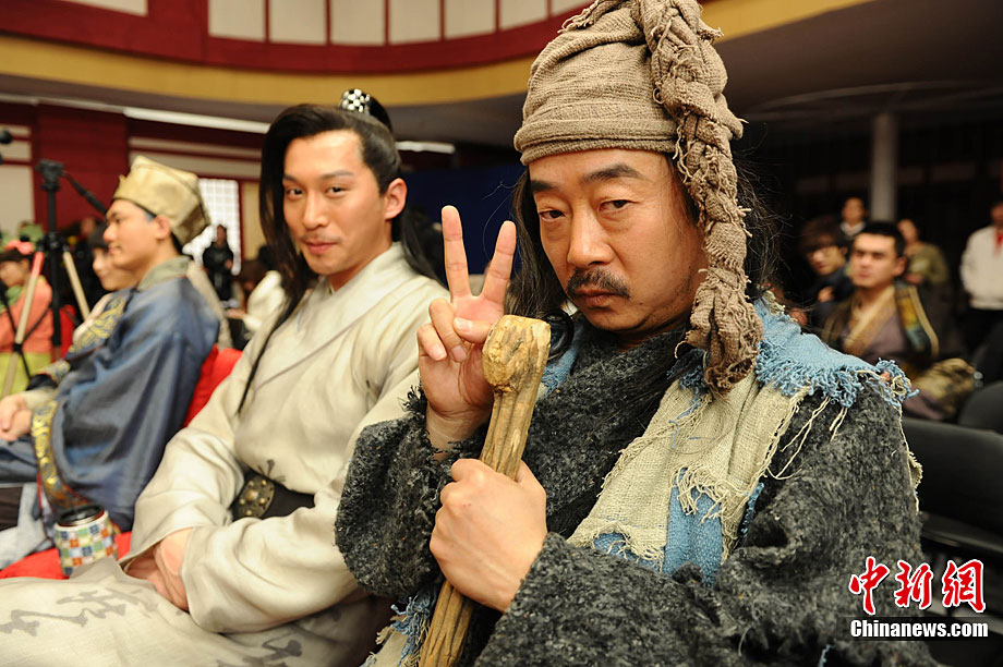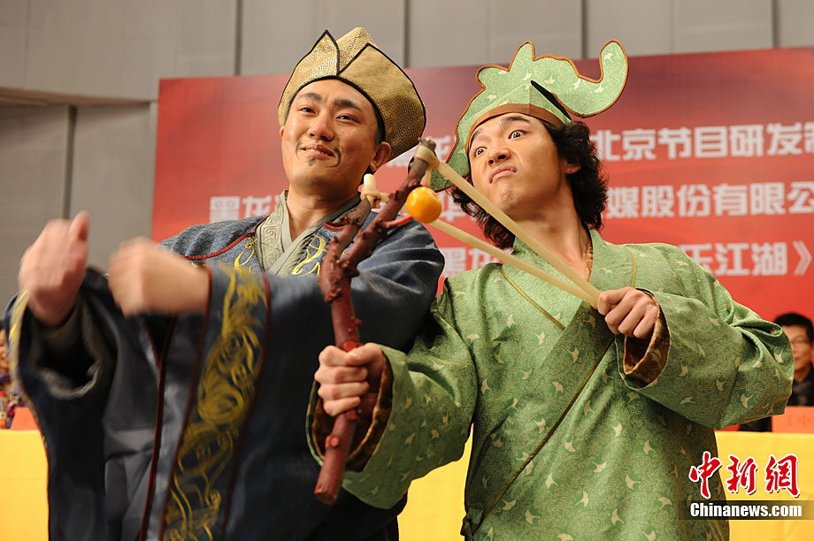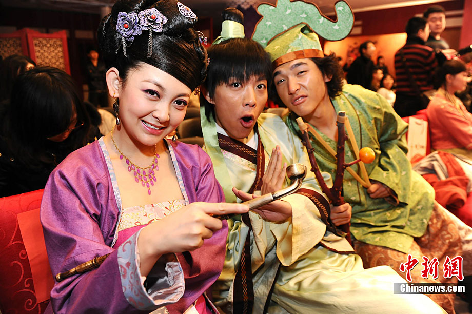 12月28日,古裝娛樂欄目劇《快樂江湖》在黑龍江電視臺北京節(jié)目研發(fā)制作中心正式開機(jī)。該劇由黑龍江電視臺與華誼兄弟聯(lián)手打造,講述了幾個(gè)現(xiàn)代人“穿越”到唐代的無厘頭爆笑故事。圖為劇中的“無厘頭”演員團(tuán)隊(duì)。中新社記者 李學(xué)仕 攝