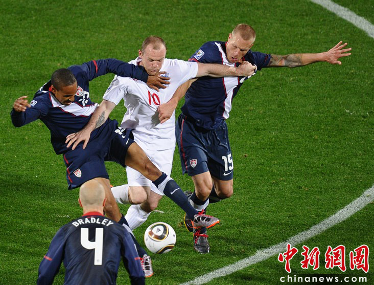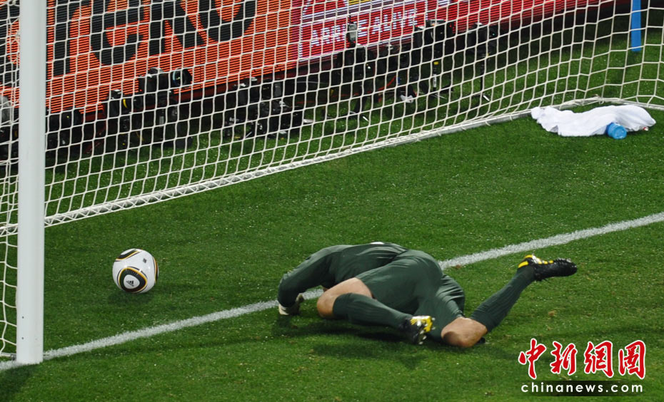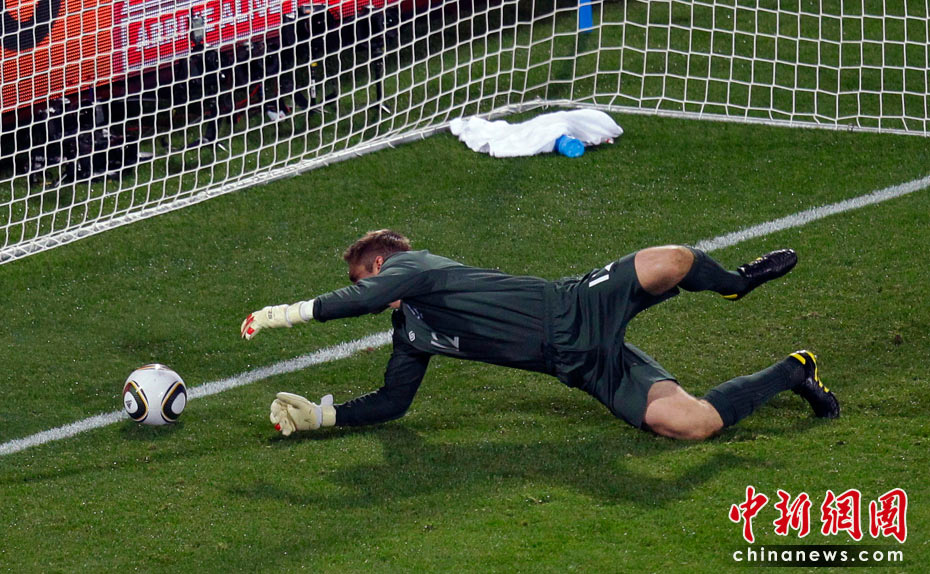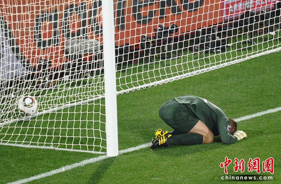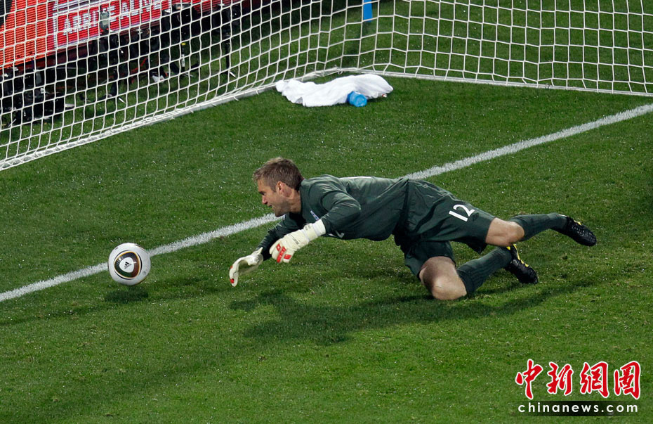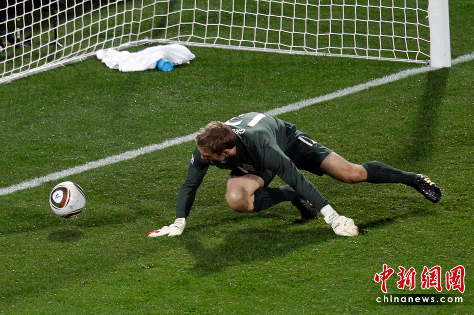 在13日凌晨2:30開始的一場南非世界杯小組賽中,英格蘭隊迎來了首個對手美國隊,雖然蘭帕德在比賽開始后先拔頭籌,但上半場臨近結(jié)束前守門員格林的一次超低級失誤斷送好局,最終雙方1-1握手言和。 圖為格林失誤的瞬間。