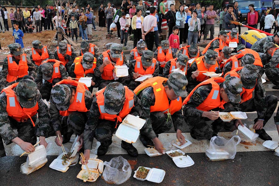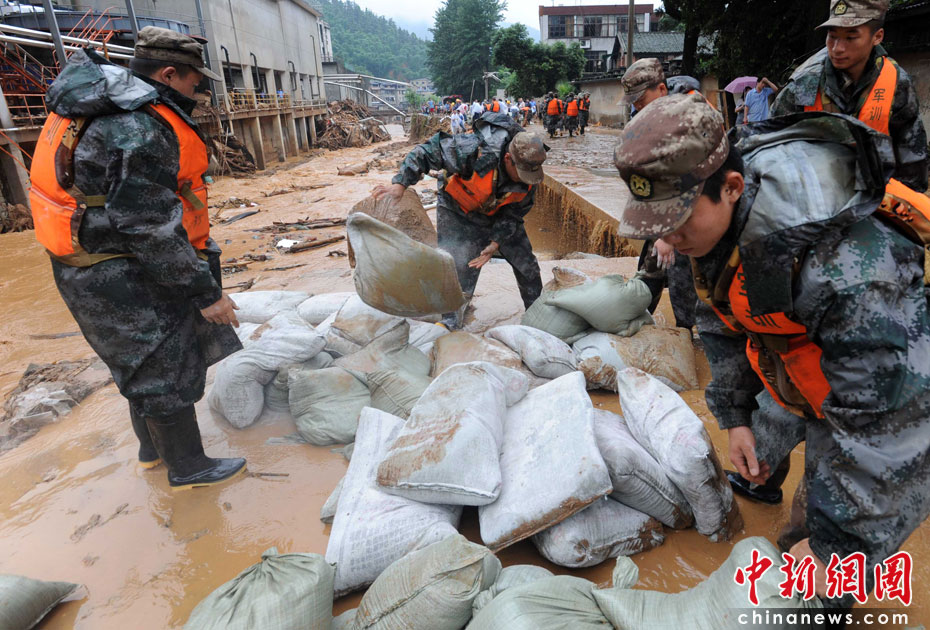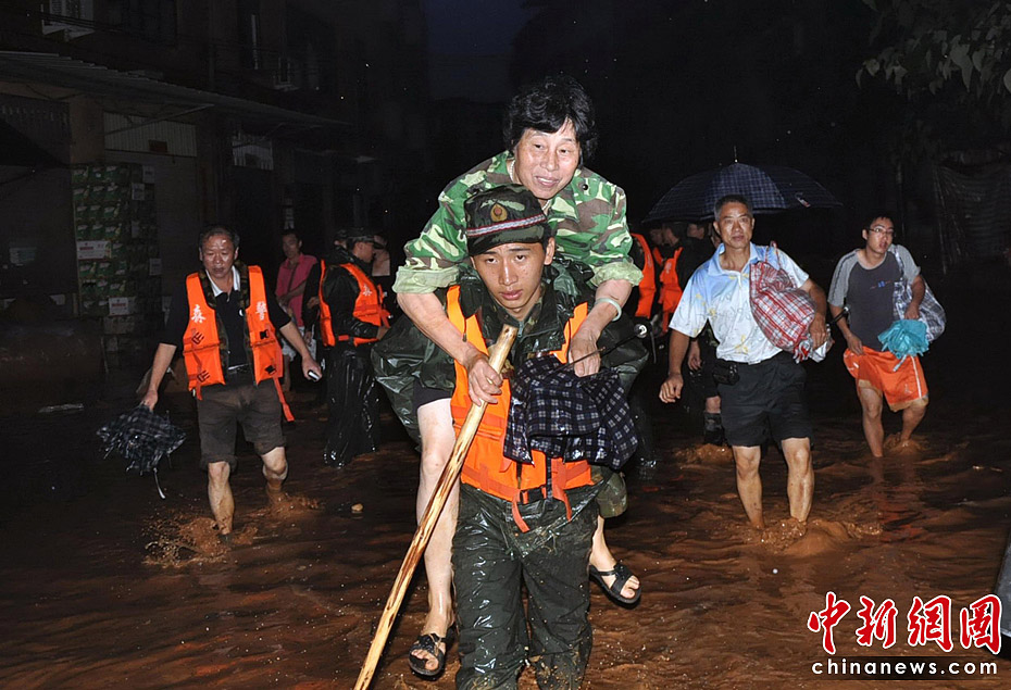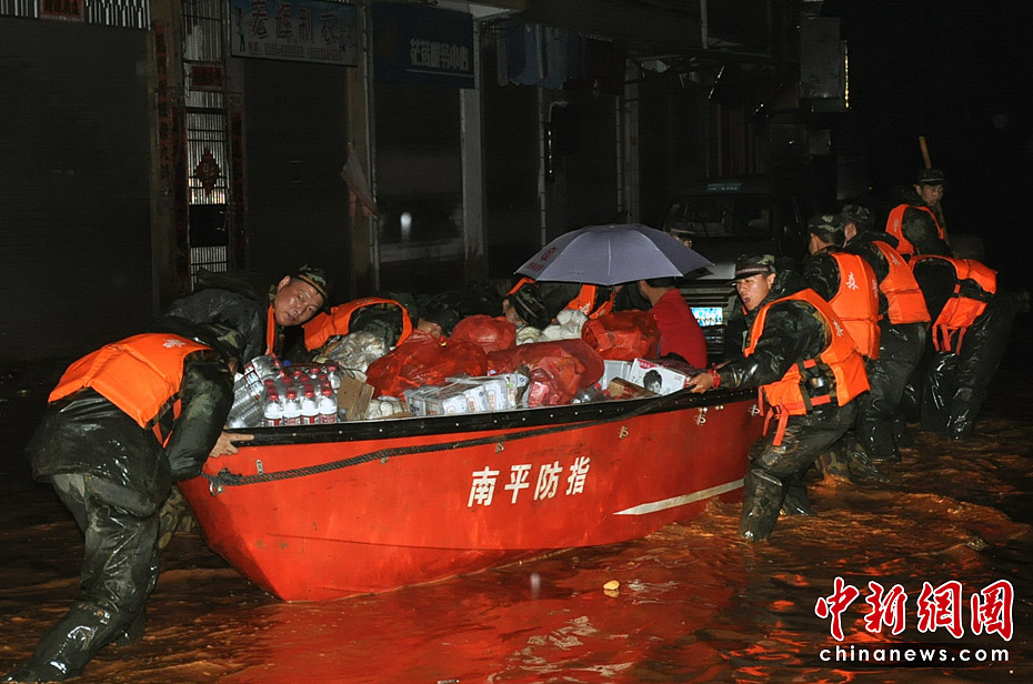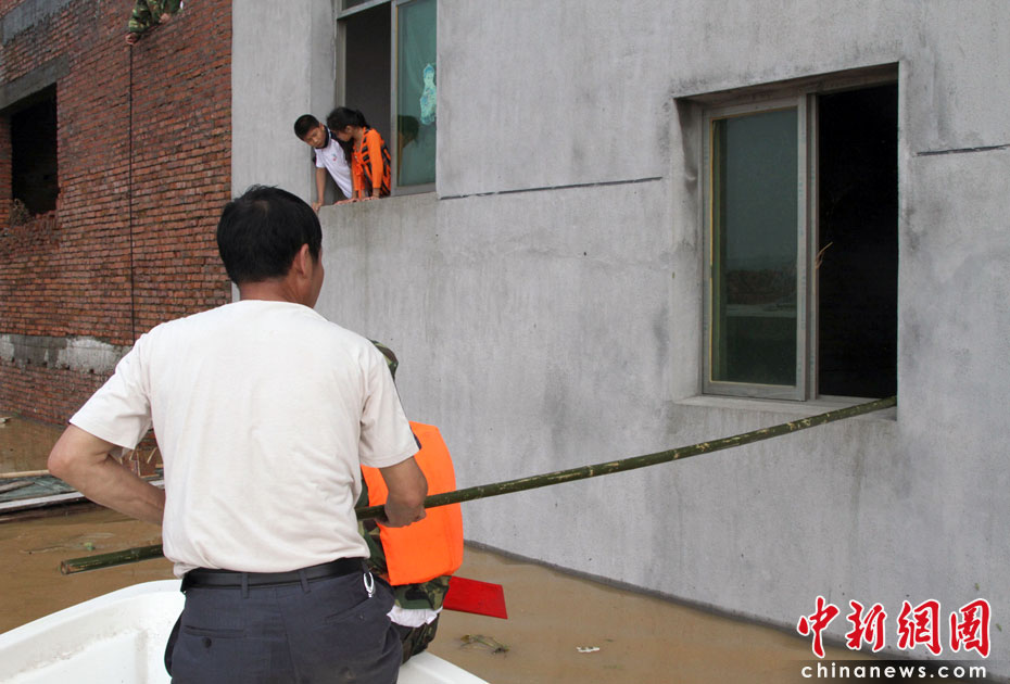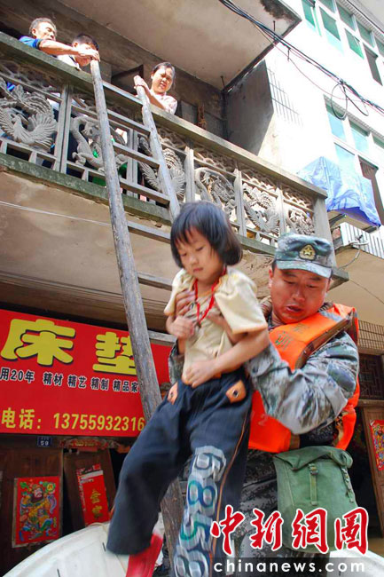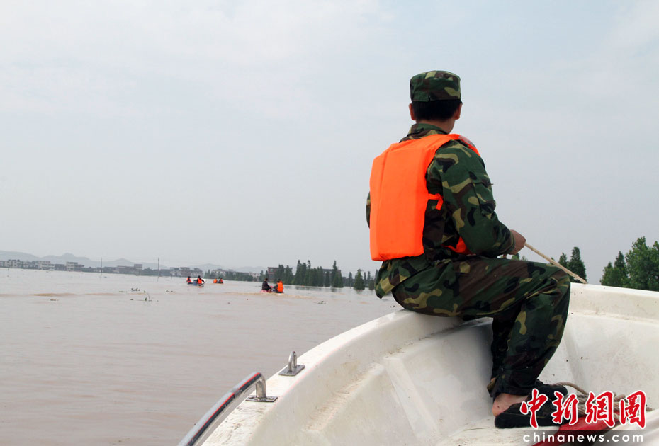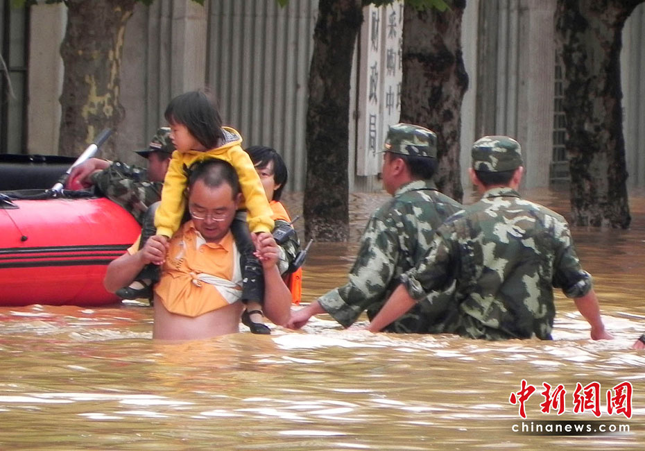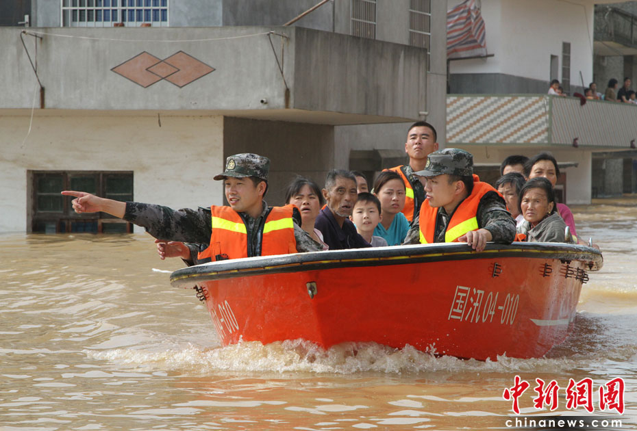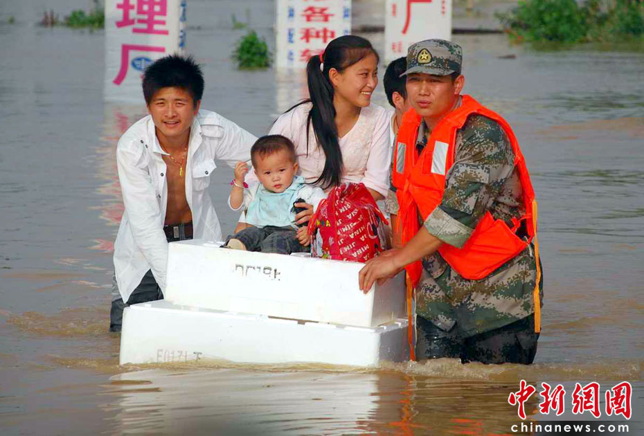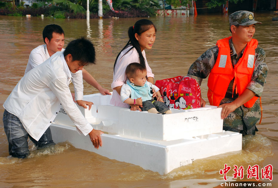 江西第二大河流撫河干流發(fā)生超歷史洪水,撫河唱凱堤21日傍晚決口,嚴(yán)重威脅下游5個鄉(xiāng)鎮(zhèn)14.5萬人口的安全。南京軍區(qū)戰(zhàn)士和群眾一起解救被洪水圍困的婦女和小孩,泡沫箱成了“生命小舟”。何柳斌 攝