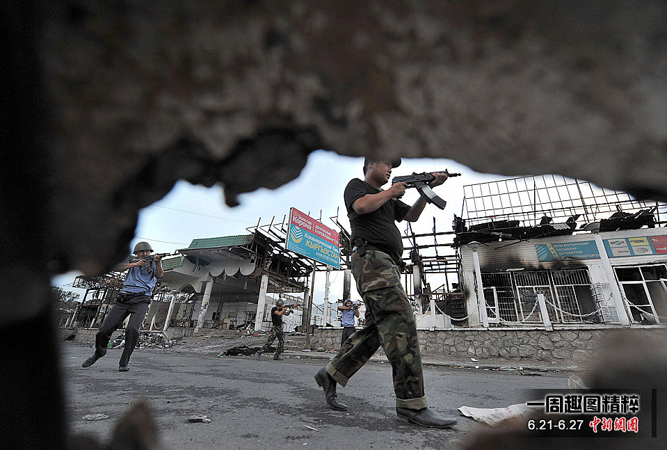 吉爾吉斯斯坦軍警在該國城市奧什的街上巡邏。在當?shù)卣l(fā)起的搜捕行動中至少有兩人喪生、23人受傷。