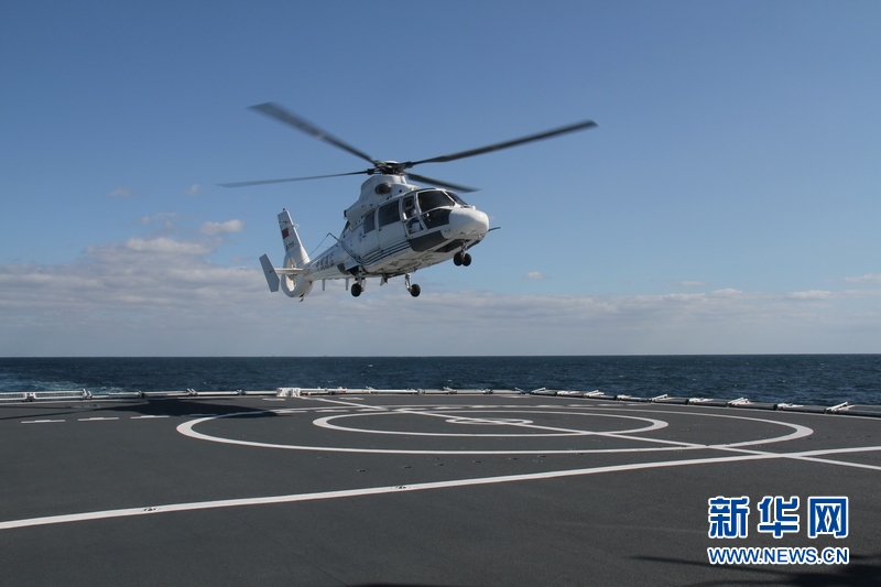 運(yùn)送“傷員”海監(jiān)直升機(jī)降落在“和平方舟”醫(yī)院船。王經(jīng)國 攝 圖片來源:新華網(wǎng)