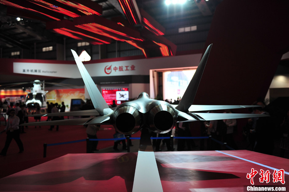 11月13日上午,第九屆中國國際航空航天博覽會在廣東珠海開幕,一架中國先進戰(zhàn)斗機概念模型在中航工業(yè)展臺亮相,從外形上看,與前不久成功試飛的殲31相似,備受關注。中新社發(fā) 柯小軍 攝