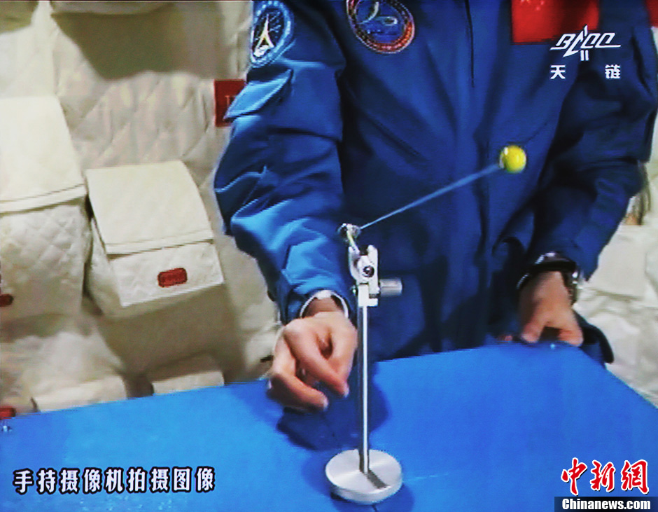 6月20日10時許,神舟十號航天員在天宮一號開展基礎(chǔ)物理實驗,為青少年進(jìn)行中國首次太空授課。圖為王亞平講授太空失重提供條件下的單擺演示。中新社發(fā) 秦憲安 攝