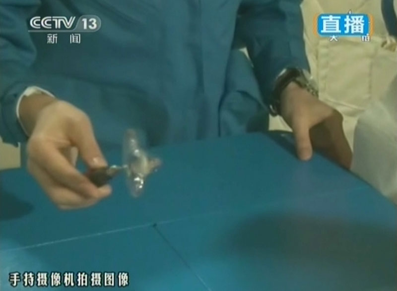6月20日上午10時(shí)許,神舟十號(hào)航天員進(jìn)行中國(guó)首次太空授課,女航天員王亞平擔(dān)任主講,成為中國(guó)首位“太空教師”。圖為王亞平進(jìn)行“水膜”演示。(視頻截圖)