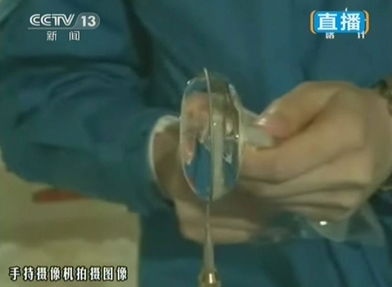 6月20日上午10時(shí)許,神舟十號(hào)航天員進(jìn)行中國(guó)首次太空授課,女航天員王亞平擔(dān)任主講,成為中國(guó)首位“太空教師”。圖為王亞平進(jìn)行“水膜”演示。(視頻截圖)