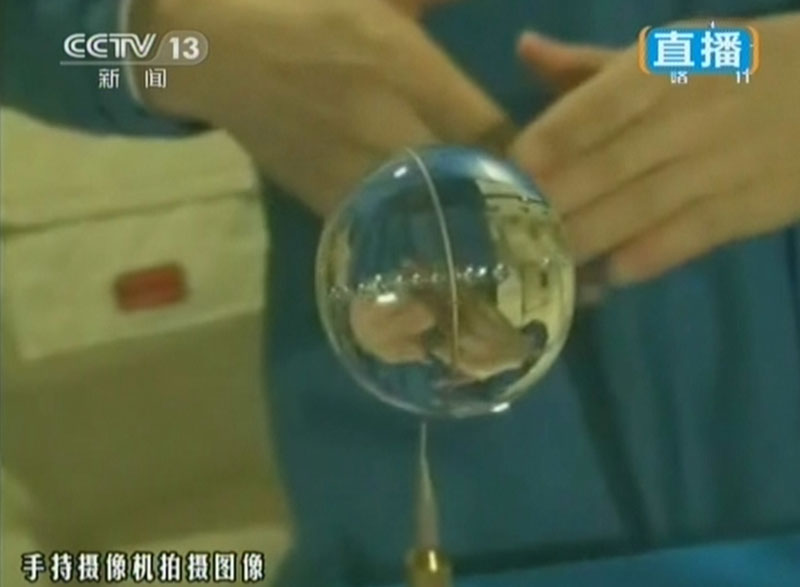 6月20日上午10時(shí)許,神舟十號航天員進(jìn)行中國首次太空授課,女航天員王亞平擔(dān)任主講,成為中國首位“太空教師”。圖為王亞平“玩水球”。(視頻截圖)