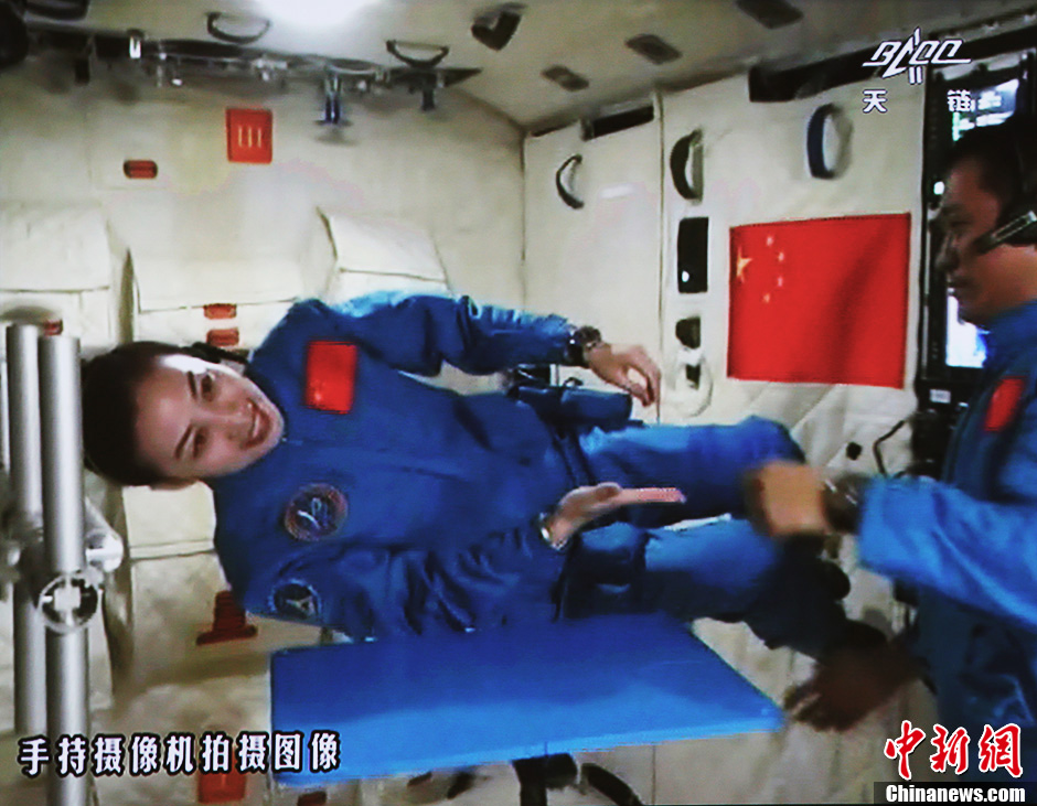 6月20日10時許,神舟十號航天員在天宮一號開展基礎物理實驗,為青少年進行中國首次太空授課。圖為王亞平講授太空失重提供條件下的方位感演示。中新社發(fā) 秦憲安 攝