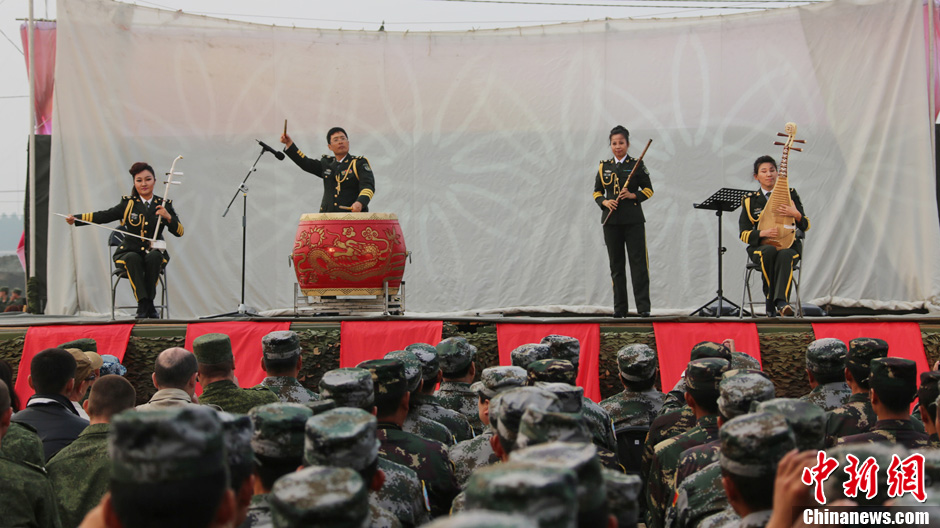 8月10日,隨同中方參演部隊赴俄羅斯參加“和平使命-2013”中俄聯演的沈陽軍區(qū)政治部文工團演員們,為中俄千余名參演官兵獻上了一場精彩的文藝晚會。豐富多彩的文藝節(jié)目,將位于切巴爾庫爾訓練場的中俄聯演野營村,變成了友誼的盛會、歡樂的海洋。圖為民樂合奏《出征》。中新社發(fā) 李祥輝 攝