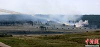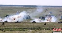 8月12日,“和平使命-2013”聯(lián)合反恐軍演中俄兩軍參演部隊在切巴爾庫爾合同訓(xùn)練場舉行全員全要素實(shí)兵協(xié)同訓(xùn)練。雙方共出動官兵近900人,坦克、步戰(zhàn)車、直升機(jī)等武器裝備約130臺,雙方導(dǎo)演部總導(dǎo)演——俄中部軍區(qū)司令員波格諾夫斯基和沈陽軍區(qū)副司令員石香元,共同到演習(xí)地觀摩并指導(dǎo)兩軍訓(xùn)練。圖為中方坦克戰(zhàn)車對恐怖武裝力量實(shí)施火力打擊。中新社發(fā) 李祥輝 攝