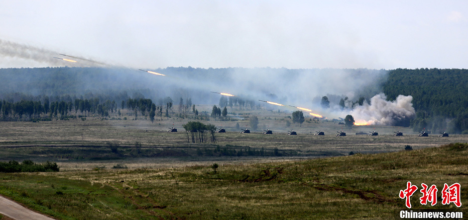 8月12日,“和平使命-2013”聯(lián)合反恐軍演中俄兩軍參演部隊在切巴爾庫爾合同訓練場舉行全員全要素實兵協(xié)同訓練。雙方共出動官兵近900人,坦克、步戰(zhàn)車、直升機等武器裝備約130臺,雙方導演部總導演——俄中部軍區(qū)司令員波格諾夫斯基和沈陽軍區(qū)副司令員石香元,共同到演習地觀摩并指導兩軍訓練。中新社發(fā) 李祥輝 攝