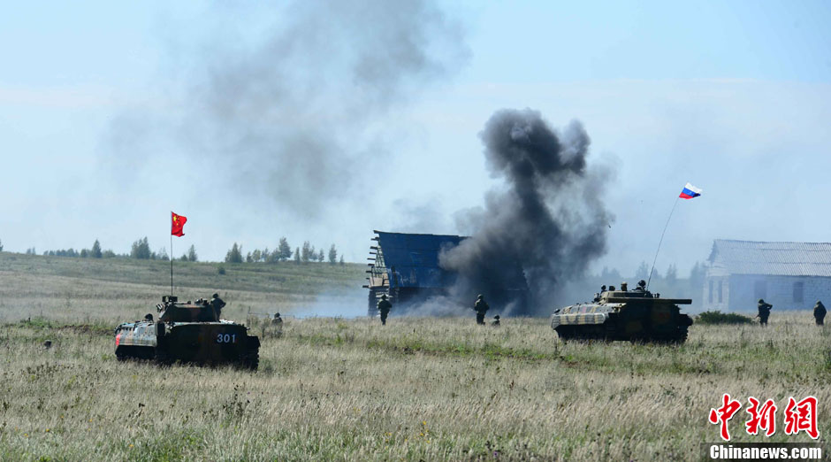 8月12日12時(shí)(北京時(shí)間下午2時(shí)),“和平使命-2013”中俄聯(lián)合反恐軍事演習(xí),在俄羅斯切巴爾庫(kù)爾合同訓(xùn)練場(chǎng)進(jìn)行了實(shí)兵實(shí)彈協(xié)同訓(xùn)練。圖為中俄雙方參演官兵共同向前推進(jìn)清剿殘敵。中新社發(fā) 譚長(zhǎng)俊 攝