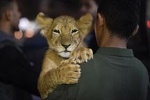 男孩抱幼獅出門做宣傳