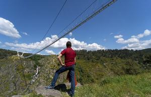 當(dāng)?shù)貢r間2021年5月2日,葡萄牙阿羅卡,世界最長人行懸索橋“516 Arouca”向民眾開放。據(jù)報道,這座橋全長516米,位于河流上方175米,橋面由金屬構(gòu)建打造,能直接透過橋面看到峽谷。 圖片來源:ICphoto