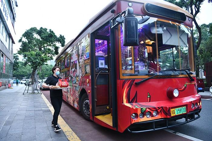 5月19日晚,一輛由公交車(chē)改成的火鍋巴士亮相成都春熙路,車(chē)上乘客可以一邊品嘗成都老火鍋,一邊欣賞成都夜色?;疱伆褪棵咳找话?,行駛途經(jīng)望平街、339電視塔、天府廣場(chǎng)等成都著名景點(diǎn)。為確保行駛安全和疫情防控,火鍋巴士駕駛員通過(guò)專門(mén)培訓(xùn),速度全程控制在20公里/小時(shí)以內(nèi)?;疱伒曛苯犹峁┲蠛玫牟似罚?chē)上不再生火。乘客也需要提前實(shí)名制預(yù)約憑綠碼上車(chē),車(chē)廂僅提供8桌最多共16人用餐。圖為市民在火鍋巴士上體驗(yàn)。 張浪 攝