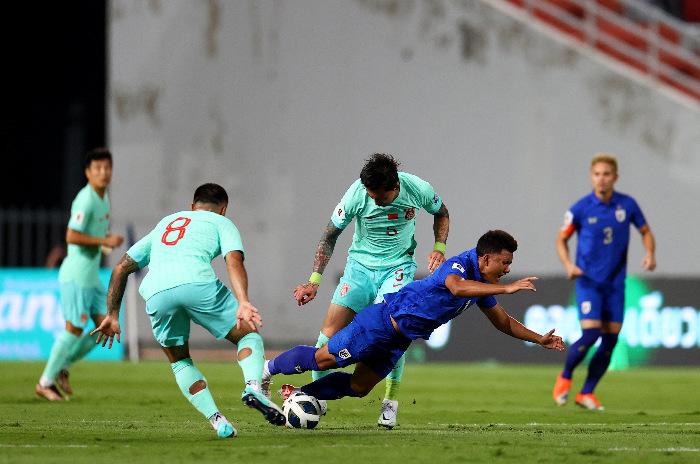 當(dāng)?shù)貢r(shí)間11月16日,在世預(yù)賽36強(qiáng)賽C組首輪角逐中,中國男足客場2:1勝泰國隊(duì)。據(jù)悉,中國隊(duì)所在小組的對手是韓國隊(duì)、泰國隊(duì)和新加坡隊(duì),四支球隊(duì)將進(jìn)行主客場循環(huán)賽。圖為中國隊(duì)球員武磊(左)與泰國隊(duì)球員在比賽中。