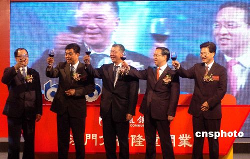 十一月一日晚,中國(guó)交通銀行澳門分行開(kāi)業(yè)儀式在旅游塔舉行,澳門特首何厚鏵(中)舉杯祝賀開(kāi)業(yè)。中新社發(fā) 史利 攝