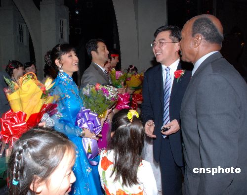 當?shù)貢r間十一月十四日晚,中國南京藝術(shù)團在美國芝加哥西北郊的珠瑞璉大劇院舉辦“和平頌”大型歌舞晚會,中國駐芝總領(lǐng)事黃屏、伊利諾州州務(wù)卿懷特、芝加哥市長代表李雙振等和近千名觀眾一起觀看了這場藝術(shù)精湛、反映蓬勃時代氣息的演出。特邀嘉賓、著名國家一級演員殷秀梅、男高音歌唱家呂繼宏和前線歌舞團的四十多位演員們的演出,受到當?shù)貎S胞的熱烈稱贊和歡迎。中新社發(fā) 張大衛(wèi) 攝