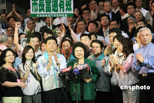 11月16日,高雄市長(zhǎng)選舉官司在當(dāng)?shù)囟䦟彾ㄗ棥4碇袊?guó)國(guó)民黨的候選人黃俊英在選舉無效和當(dāng)選無效兩項(xiàng)訴訟中均遭判敗訴。民進(jìn)黨的陳菊(前中)在去年12月9日勝出擔(dān)任市長(zhǎng)后,今次獲承辦法官支持繼續(xù)擔(dān)任市長(zhǎng)。今年6月15日,該官司一審曾判,選舉有效,但陳菊當(dāng)選無效。圖為陳菊在獲知贏得官司后,于高雄市政府前對(duì)支持者允諾未來3年會(huì)以推動(dòng)市民利益的建設(shè)為優(yōu)先。中新社發(fā) 黃少華 攝