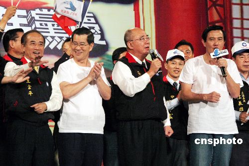 11月24日,中國國民黨在臺灣中部的嘉義市舉行萬人造勢活動,紀念該黨成立一百一十三周年,也為明年臺灣的兩次重要選舉拉抬聲勢。圖為馬英九、蕭萬長、吳伯雄、王金平等全體與會者高唱《我們都是一家人》、《愛拚才會贏》等歌。整個造勢活動突出“拚經濟、顧生活”的訴求和“以臺灣為主,對人民有利”的主題。中新社發(fā) 黃少華 攝