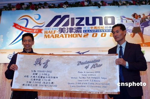 11月30日,香港資深長(zhǎng)跑好手李嘉綸(左)代表參賽跑手,從香港田徑總會(huì)長(zhǎng)跑部主委王劍麟手中接過(guò)參賽戰(zhàn)書(shū)。香港業(yè)余田徑總會(huì)當(dāng)日宣布,一年一度的香港半馬拉松錦標(biāo)賽將于2008年1月6日舉行。中新社發(fā) 蔡蔓莉 攝